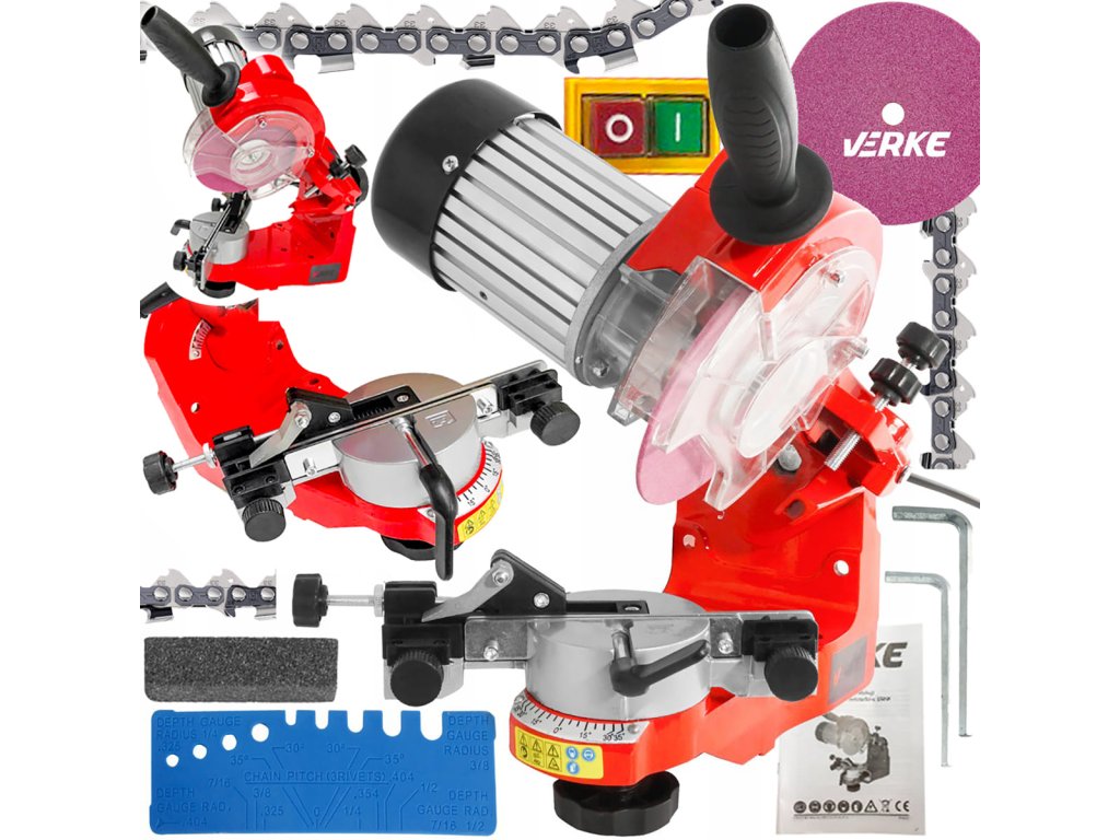 Ostřička na řetězy VERKE je silné a spolehlivé zařízení určené k ostření řetězů motorových a elektrických pil. Speciální konstrukce ostřičky umožňuje naostření každého zubu řetězu stejným, opakovatelným způsobem. Tato ostřička je vybavena výkonným motorem s výkonem 230 W, kotoučem o průměru 145 mm a otočným svěrákem s nastavitelným úhlem ostření, což umožňuje snadné a účinné ostření řetězů.