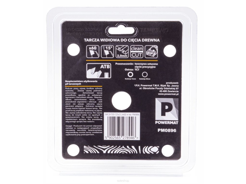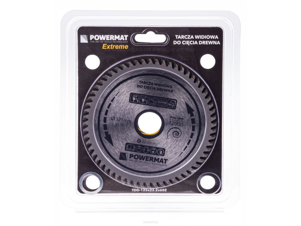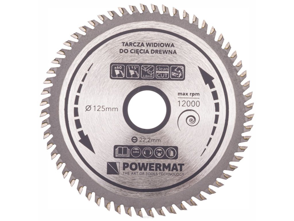 Vidiový kotouč na dřevo 125x22.2 60z TDD-125x22.2x60Z, Powermat PM0896 z kalené oceli obsahuje 60 řezných zubů.