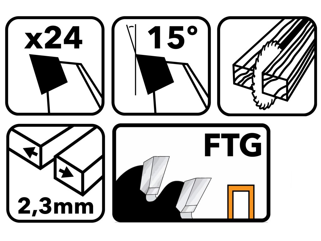 - Odolný kotouč z kalené oceli – vybavený 24 tvrdokovovými zuby TCT (Tungsten Carbide Tipped), které zajišťují dlouhou životnost, vysokou ostrost a čistý řez bez otřepů.