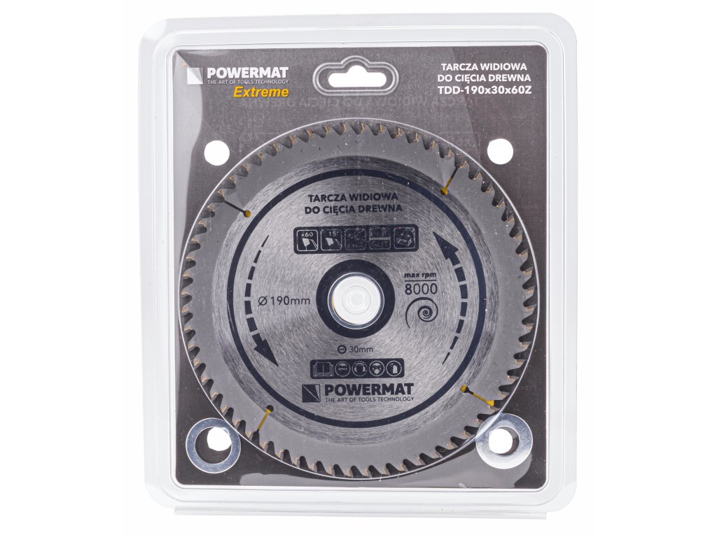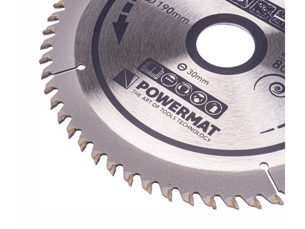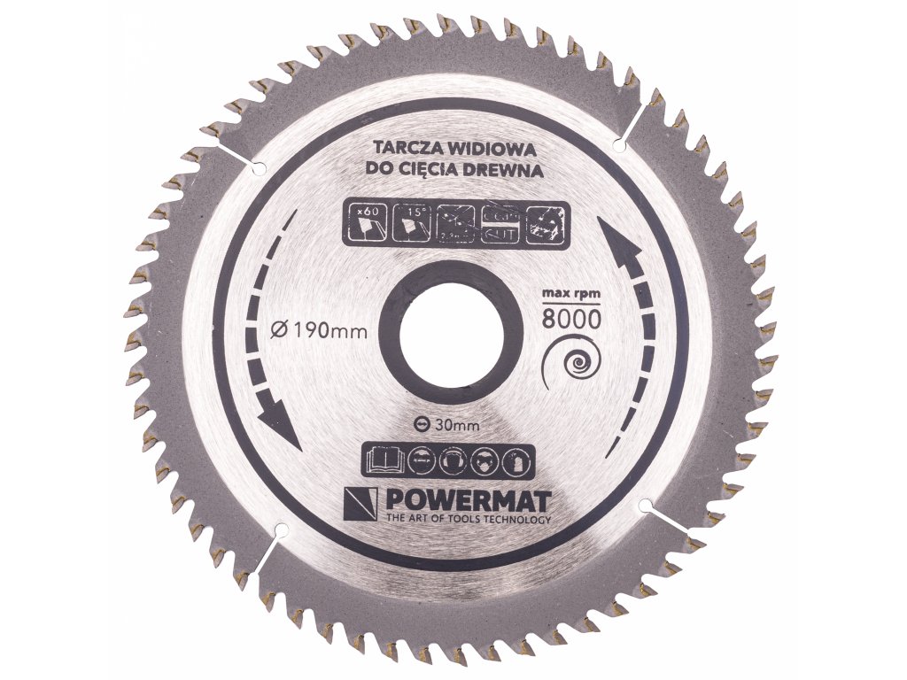 Pilový kotouč Powermat TDD-190x30x60Z je určený pro jemné, čisté a precizní řezání dřeva i materiálů na bázi dřeva. Díky 60 tvrdokovovým zubům (TCT – Tungsten Carbide Tipped) s geometrií ATB (Alternate Top Bevel) dosahuje hladkého řezu s minimálním třepením. Je vhodný pro ruční pily, menší pokosové a stolní pily, kde se vyžaduje vysoká přesnost – např. při řezání desek, překližky, dřevotřísky nebo tvrdého dřeva.