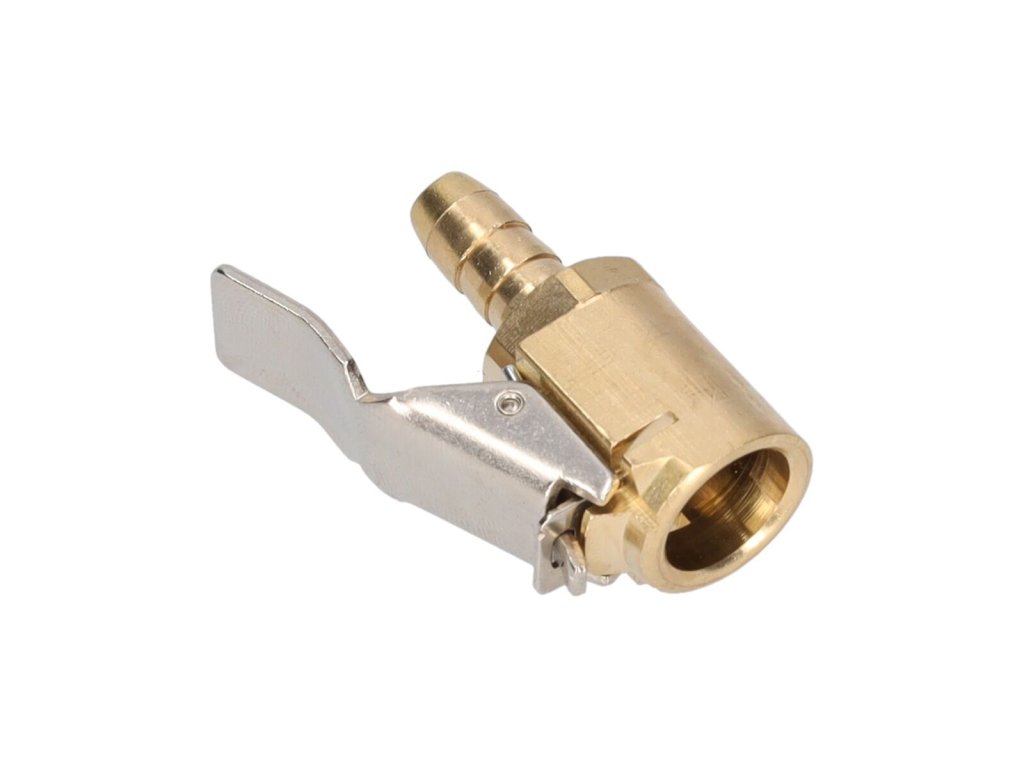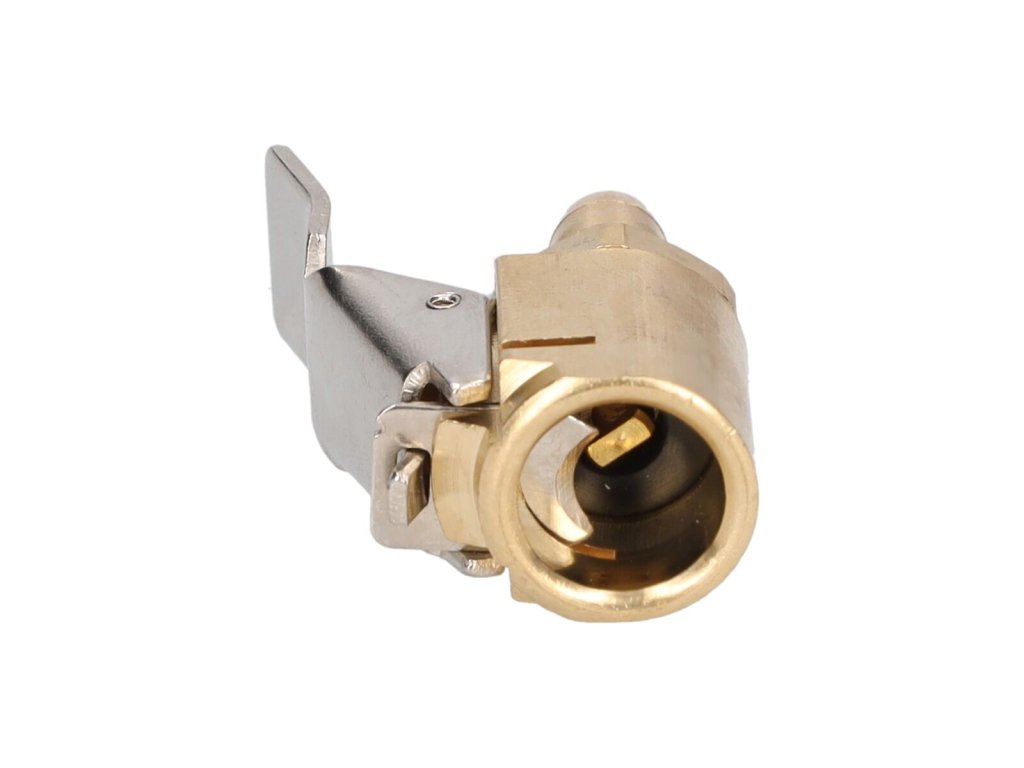 Mosazná koncovka se zajišťovací pákou určená k huštění pneumatik strojů s velkým průměrem kol. Vhodná pro profesionální použití v servisech a dílnách zaměřených na údržbu těžkých strojů.