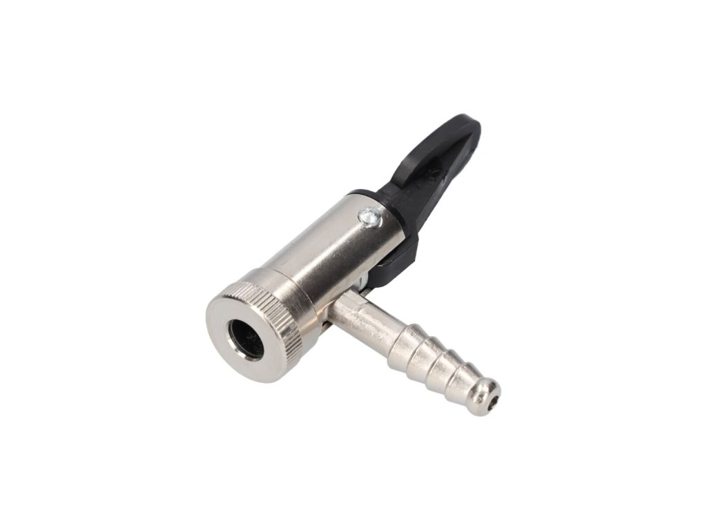 Vyrobena z odolného kovu s poniklovaným povrchem, vybavena plastovým aretačním klipem pro snadné a bezpečné uchycení. Kompatibilní s gumovými i plastovými hadicemi o průměru 8 mm. Koncovka je vhodná pro huštění pneumatik osobních i užitkových vozidel, motocyklů, elektrokol nebo jízdních kol.