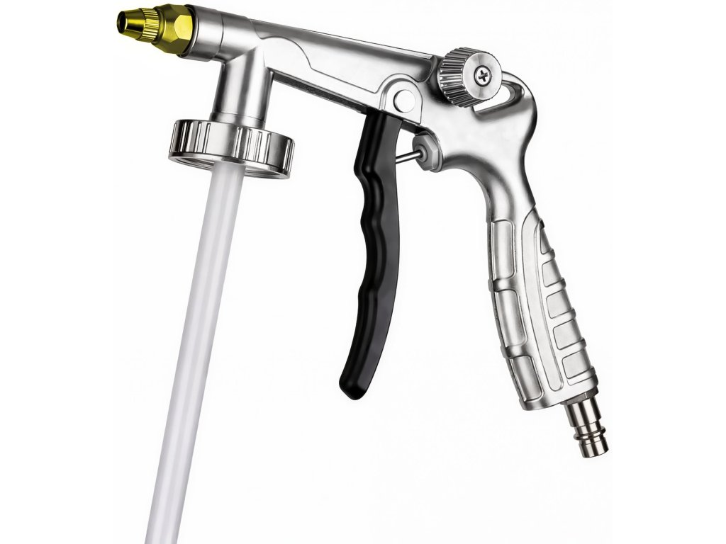 Tělo pistole je vyrobeno z hliníku, což zajišťuje nízkou hmotnost a vysokou odolnost proti poškození. Protiskluzová rukojeť zvyšuje komfort i bezpečnost práce při delším používání. Model KD5791 je kompatibilní se standardními nádobami 1 l a 2 l se závitem. Součástí balení je hadička zakončená mosaznou rozprašovací tryskou pro přesnou aplikaci přípravků do uzavřených profilů.