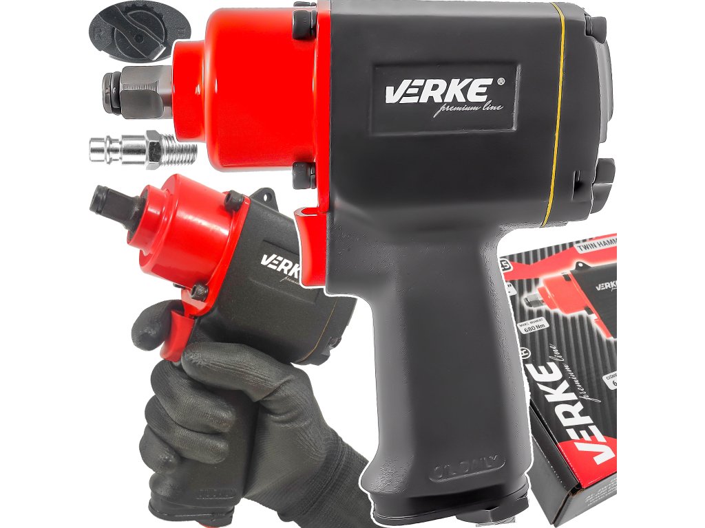 Pneumatický rázový utahovák slouží k utahování a povolování šroubů, matic a dalších závitových montážních prvků. Utahovák značky Verke Premium Line je profesionální nástroj, který vás vždy podpoří při práci. Toto zařízení je vybaveno dvojitým úderným mechanismem TWIN HAMMER. Skládá se ze dvou kladiv, která se otáčejí kolem vřetena v uzavřeném systému. Toto řešení umožňuje dosáhnout enormního točivého momentu během prvních otáček rotoru, protože obě kladiva mohou současně udeřit z obou stran. Tato konstrukce s dvěma kruhovými kladivy se vyznačuje vysokou odolností a je zvláště vhodná pro dlouhé pracovní cykly. Utahovák má přepínač směru otáčení vlevo/vpravo a regulaci točivého momentu. Jsou to nástroje odolné, silné a spolehlivé, takže můžete pracovat rychleji a efektivněji. Speciálně tvarovaná rukojeť umožňuje pohodlnou práci a plnou kontrolu nad zařízením.
