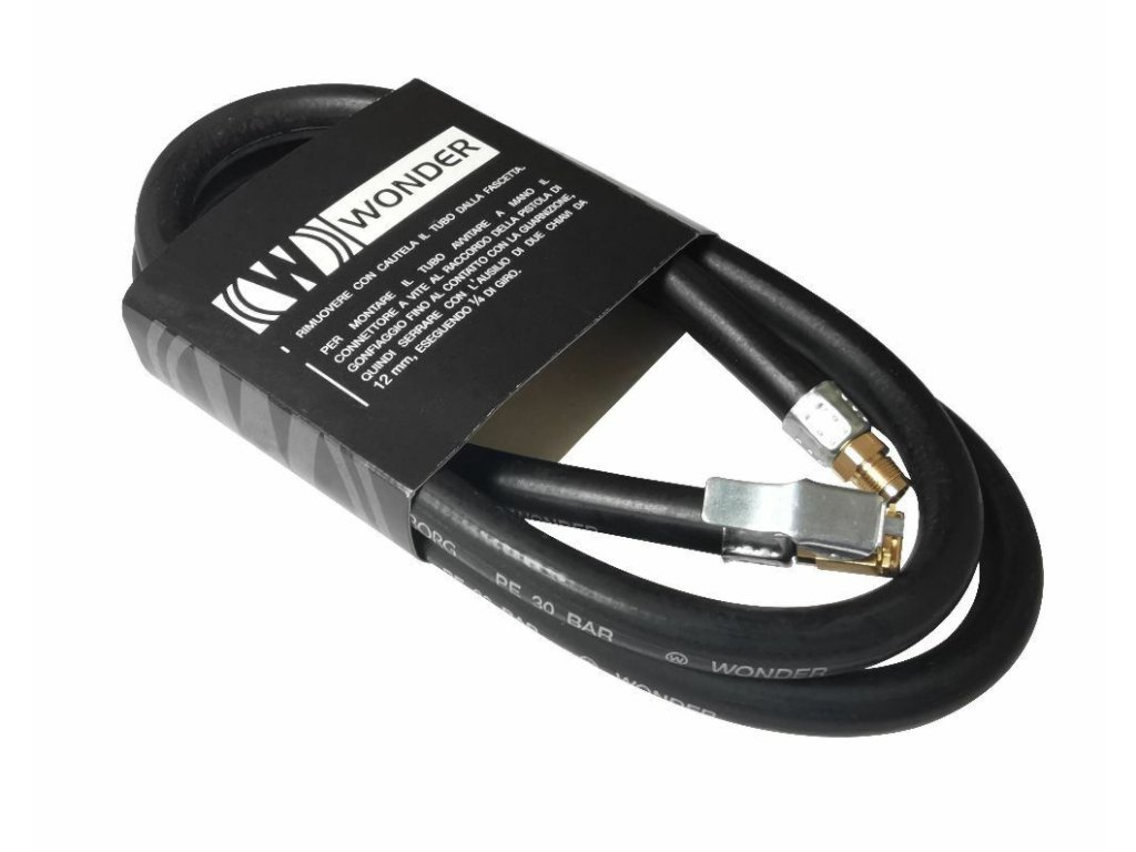Originální hadice o délce 150 cm určená pro pistole na huštění pneumatik EURODAINU od italské značky WONDER. Hadice je z jedné strany zakončena standardní 8 mm koncovkou na huštění pneumatik, z druhé strany závitem pro připojení k pistoli.
