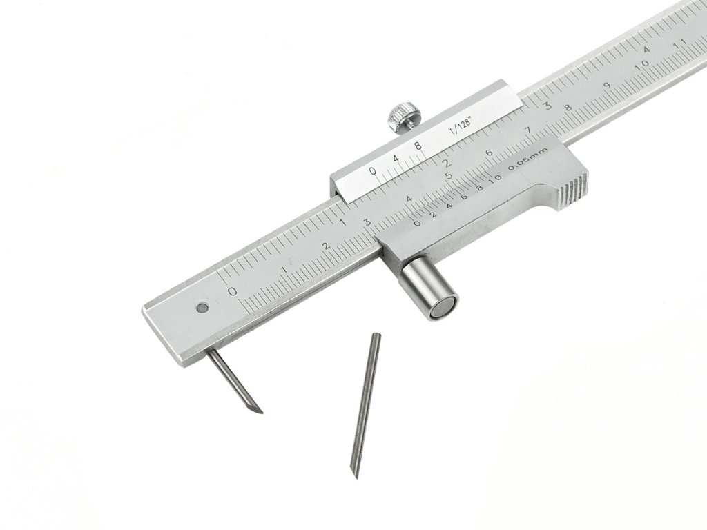 Měřítko je vyrobeno z nerezové oceli a vybaveno rýsovacím hrotem z kalené oceli. Součástí balení je také druhý náhradní hrot.