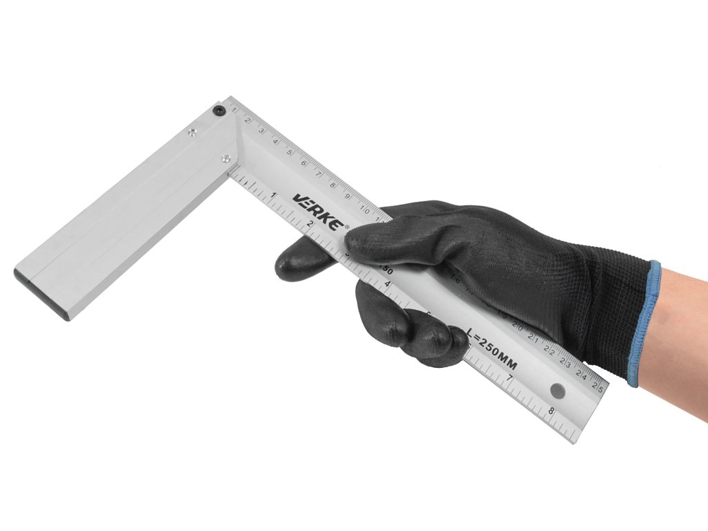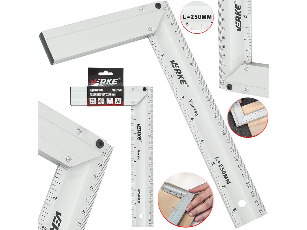 Hliníkový úhelník značky Verke o délce 250 mm je praktický měřicí nástroj určený pro přesné práce ve stavebnictví, truhlářství i dílně. Je vyroben z tvrzeného hliníku, který zajišťuje vysokou odolnost a dlouhou životnost.