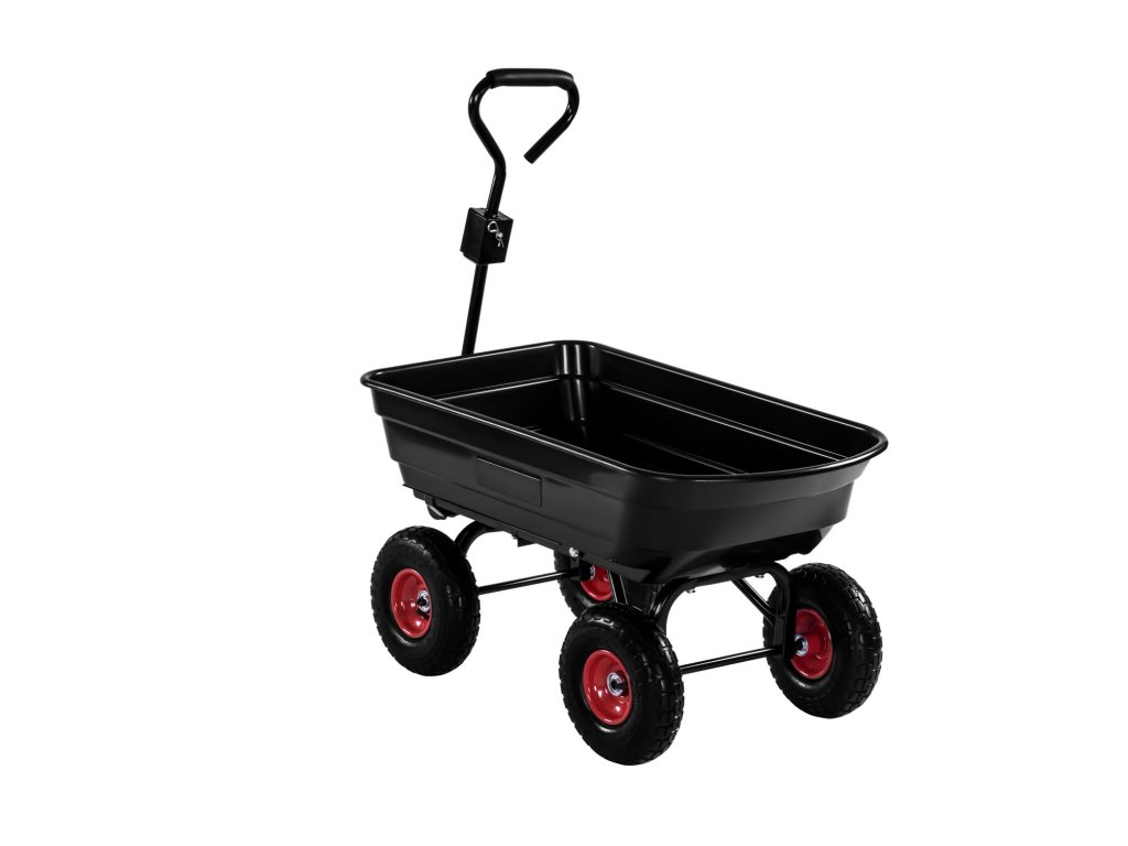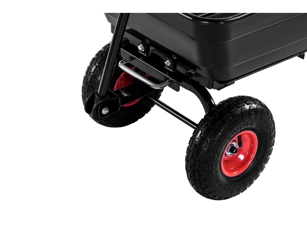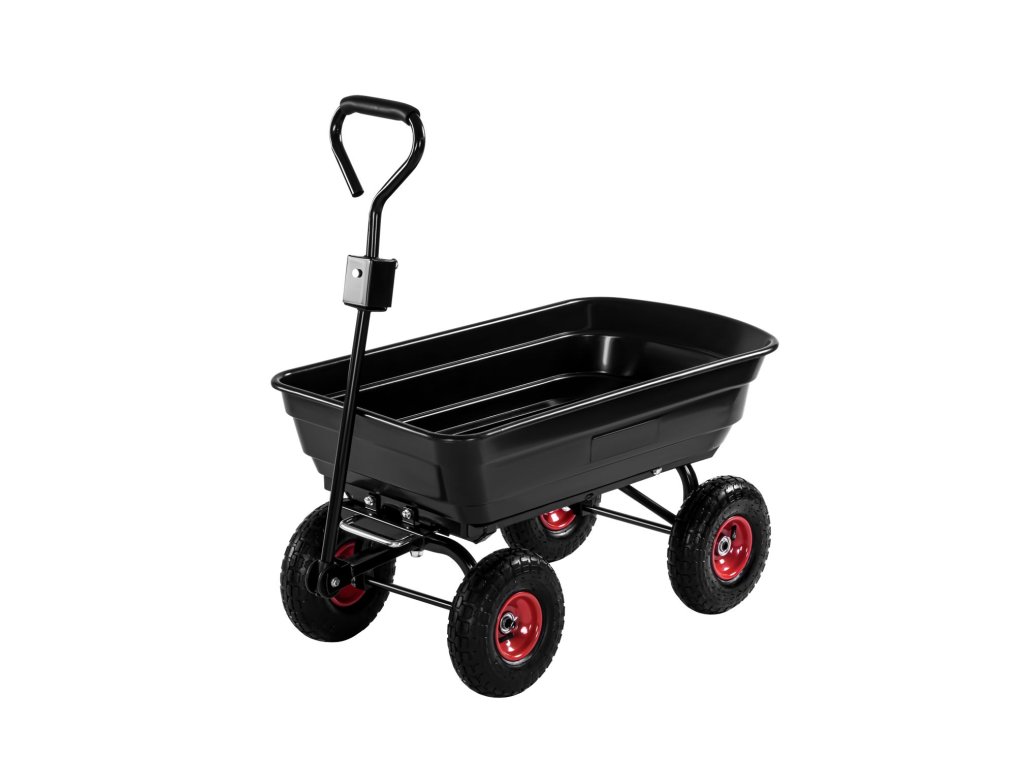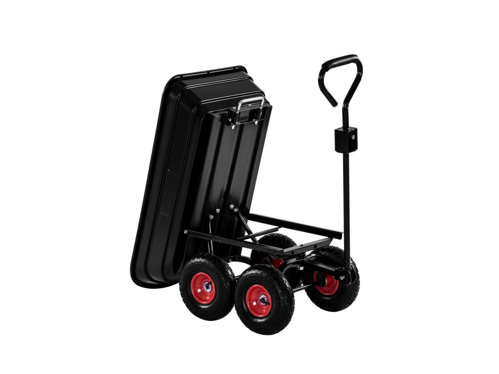 Konstrukce vozíku je vyrobena z odolných materiálů, což zaručuje stabilitu a dlouhou životnost i při intenzivním používání. Pneumatická kola zajišťují pohodlnou manipulaci i na nerovném terénu. Praktická funkce vyklápění umožňuje rychlou a pohodlnou vykládku nákladu, zatímco ergonomická rukojeť usnadňuje vedení vozíku.