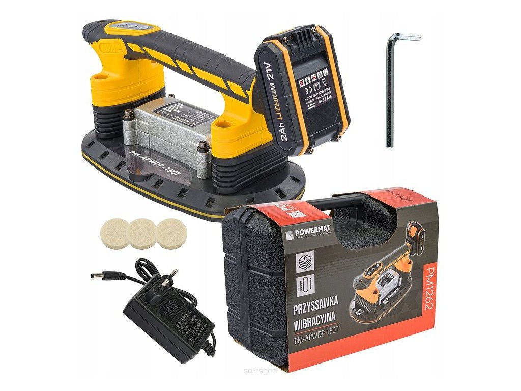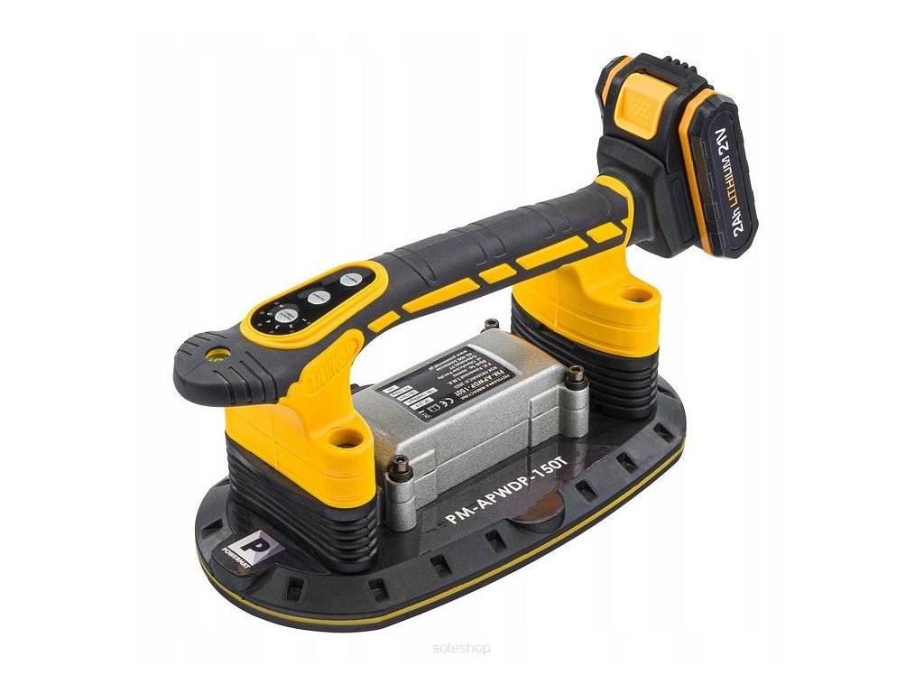 Vibrační přísavka na pokládku dlažby 2xAKU 21V PM-APWDP-150T, Powermat PM1262 napájená 21V lithiovou baterií je vhodná pro vnitřní i vnější instalace. Nahrazuje tradiční ruční manipulaci a pomáhá předejít problémům způsobeným nesprávným rozprostřením lepidla pod dlaždicemi a velkými deskami. Speciální tvar a dvojitá rukojeť zajišťují vyvážení břemene při zvedání a pokládání dlaždic a umožňují lepší ovládání zařízení. Měkké vložky na rukojeti zajišťují ergonomický a bezpečný úchop. Zařízení je velmi kompaktní a lehké, umožňuje uchycení dlaždic přísavkou (s možností zvednutí až 150 kg) a díky vibracím odstraňuje zbývající vzduchové bublinky, které by mohly mezi lepidlem a dlaždicí způsobit potenciální praskání. Intenzita vibrací je regulovatelná silou stisku spínače.