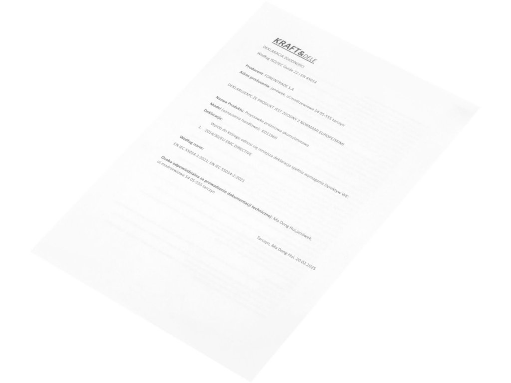 Zařízení je vybaveno vestavěným akumulátorem s kapacitou 3000 mAh a moderním napájením přes port USB-C, což zajišťuje dlouhou dobu provozu na jedno nabití a rychlé, pohodlné dobíjení. Ergonomická a robustní konstrukce poskytuje uživateli komfort i bezpečnost při manipulaci s těžkými materiály.