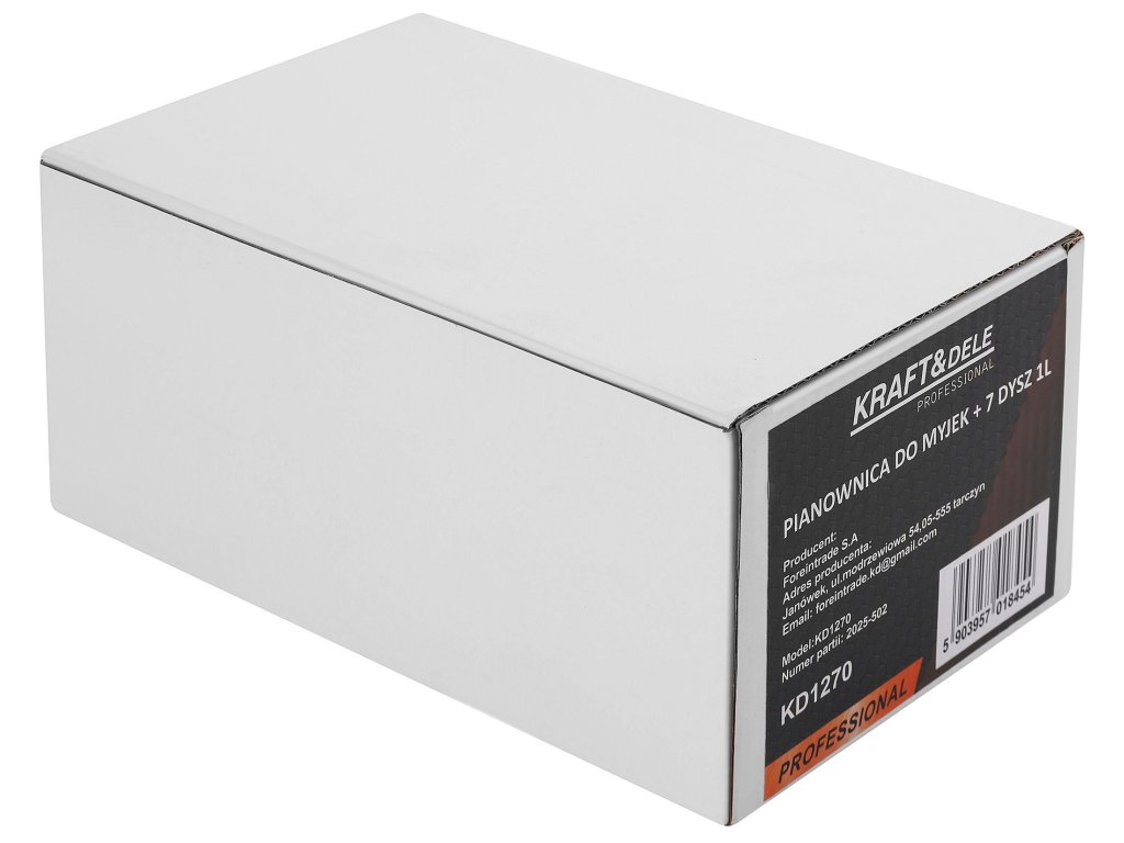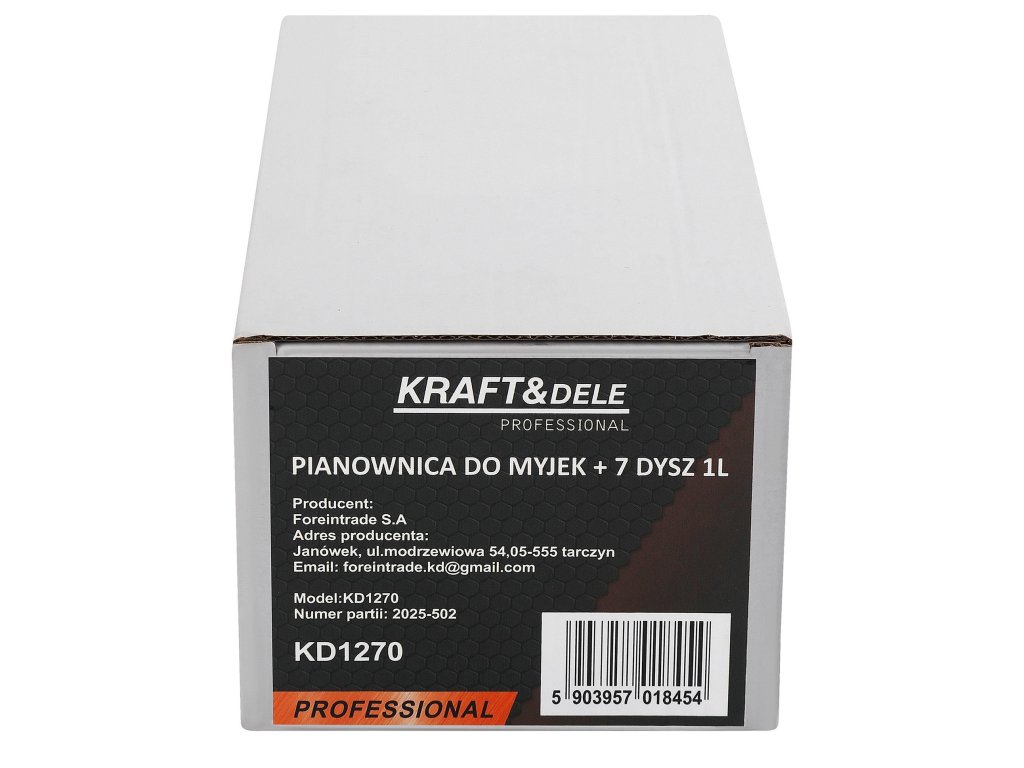 Pěnovací nástavec Kraft&Dele KD1270 je praktické příslušenství k tlakovým myčkám, které umožňuje rychlé a efektivní nanášení aktivní pěny na různé povrchy. Je vybaven nádobou o objemu 1 litr a sadou 7 trysek, díky nimž lze přizpůsobit proud pěny různým úkolům – od šetrného mytí vozidel až po intenzivní čištění průmyslových ploch.