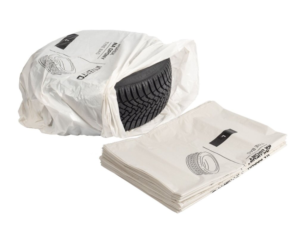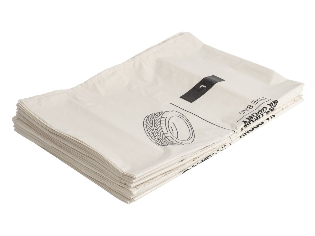 Každý pytel pojme až dvě pneumatiky do velikosti 16" (např. 205/70 R16) a je vyroben z odolného plastu LDPE s pevnými sváry.