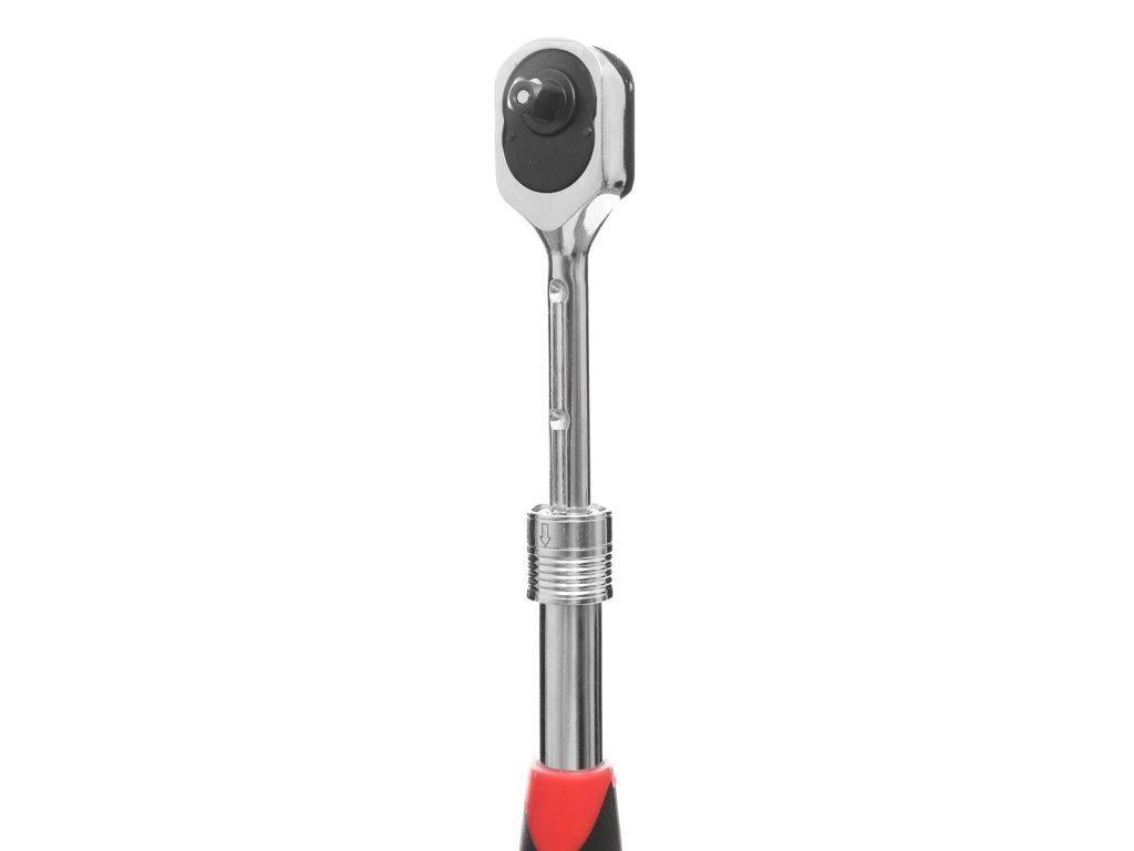 Díky teleskopickému provedení lze nastavit délku rukojeti podle potřeby, čímž se zvyšuje síla utahování i pohodlí při práci. Protiskluzová rukojeť a přepínací přepínač směru otáčení zajišťují komfortní manipulaci v každé situaci.
