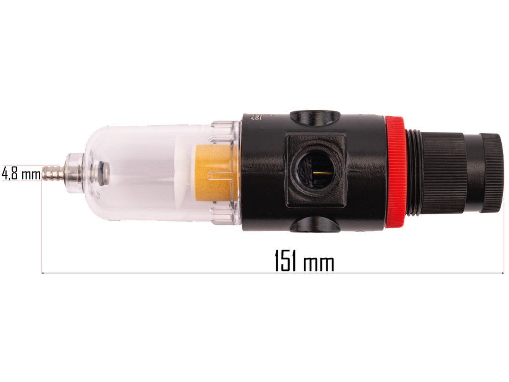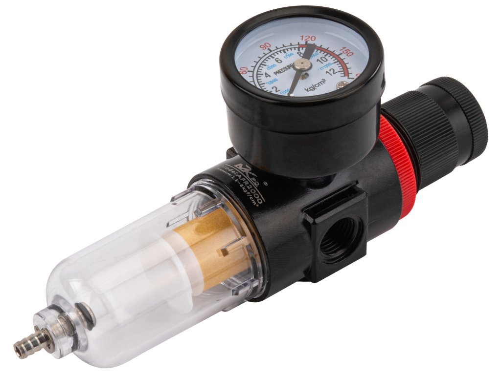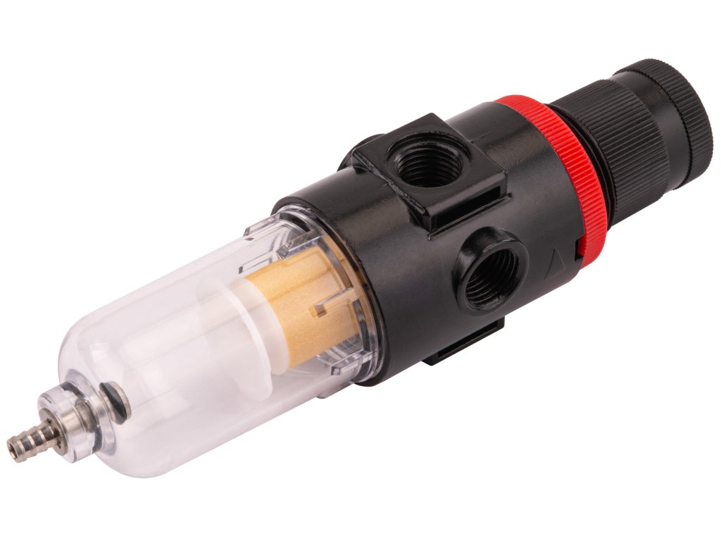 Redukční ventil s odlučovačem vody je originální náhradní díl určený pro kompresory Powermat PM-KO-100T-V2, PM-KBO-6T, PM-KBO-24T, PM-KBO-50T a PM-KBO-100T. Zajišťuje stabilní tlak vzduchu a současně odstraňuje kondenzát z výstupního vzduchu, čímž chrání připojené pneumatické nářadí před poškozením vlhkostí.