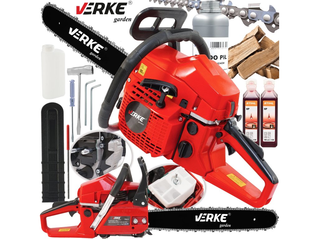 Benzínová řetězová pila renomované značky VERKE GARDEN s velmi silným a výkonným motorem 3,4 HP je nenahraditelným zařízením pro každého pilaře. Vysoký výkon pily si poradí s různými druhy dřeva a stromů, ideálně se hodí pro řezání palivového dřeva i pro prořezávání větví. Je vybavena systémem Easy Start, který výrazně snižuje sílu potřebnou k nastartování motoru. Pila má také systém proti vibracím a automatické mazání. Dobře umístěná rukojeť a těžiště zařízení umožňují dlouhodobou práci bez únavy. Pila se vyznačuje velmi dobrou kvalitou zpracování a vynikajícími komponenty použitými při její výrobě. Její nízká hmotnost a vysoký výkon z ní činí nenahraditelného pomocníka v každé domácnosti.