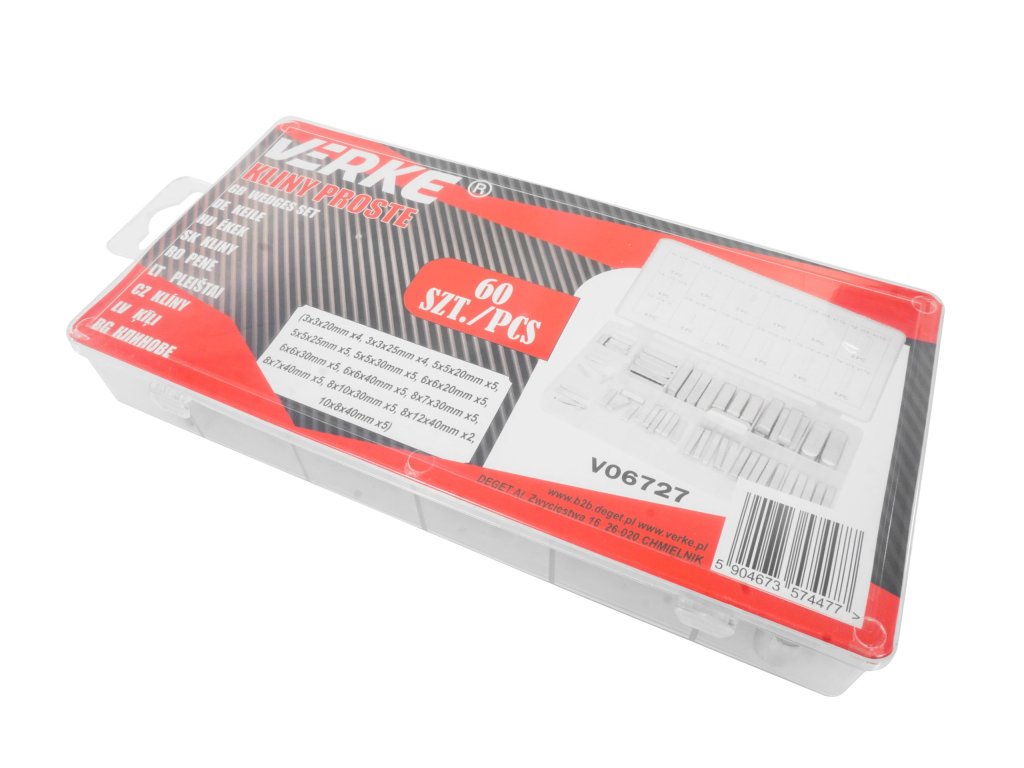 Praktická sada rovných klínků značky Verke v různých velikostech, uložená v přehledném a удобném organizéru. Klínky jsou vhodné pro široké využití v dílně, při opravách i montážních pracích.