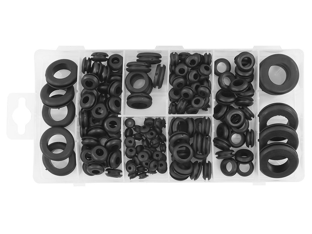 Sada obsahuje 180 kusů průchodek v různých velikostech: 6 mm, 7,3 mm, 8,7 mm, 10,5 mm, 12 mm, 14,8 mm, 21 mm, 24 mm