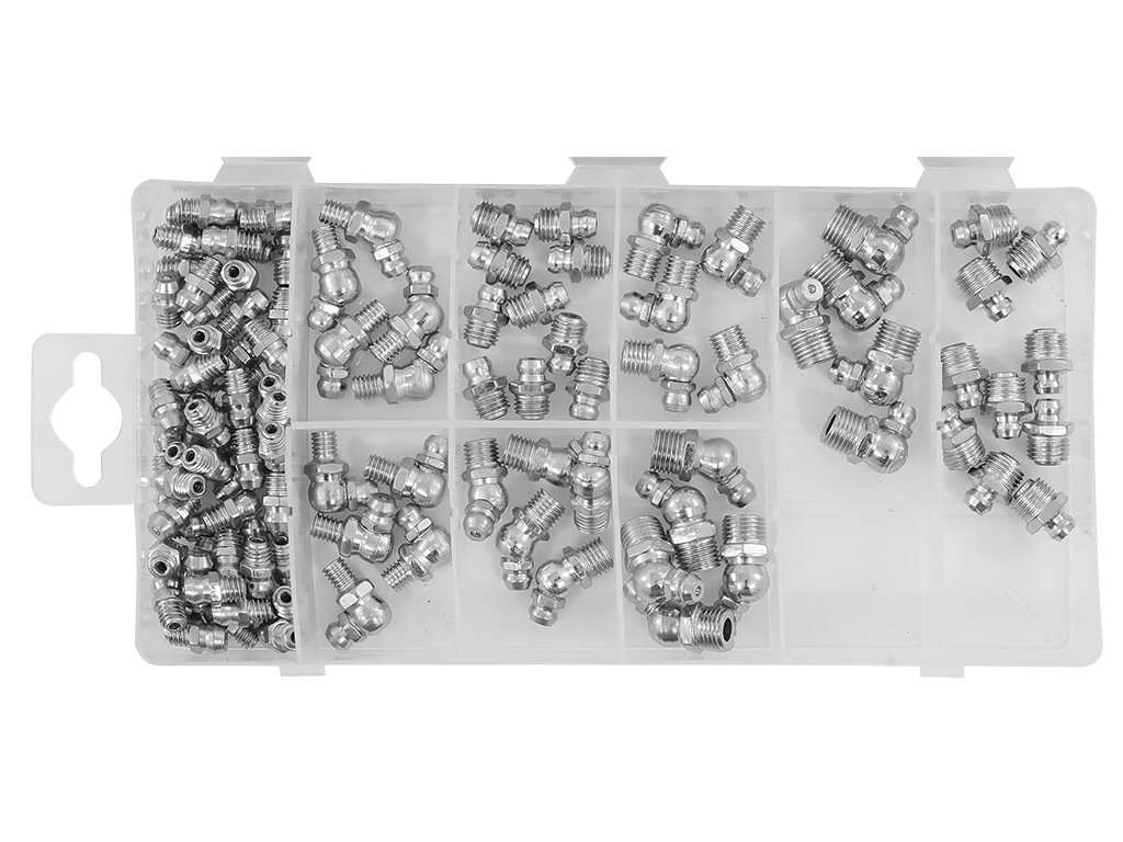 Sada obsahující 110 kusů maznic. Závity jsou řezány v metrickém systému. Mix 9 velikostí je zabalen v praktickém organizéru. Nezbytné pro použití v automobilovém průmyslu, zemědělství nebo průmyslu.