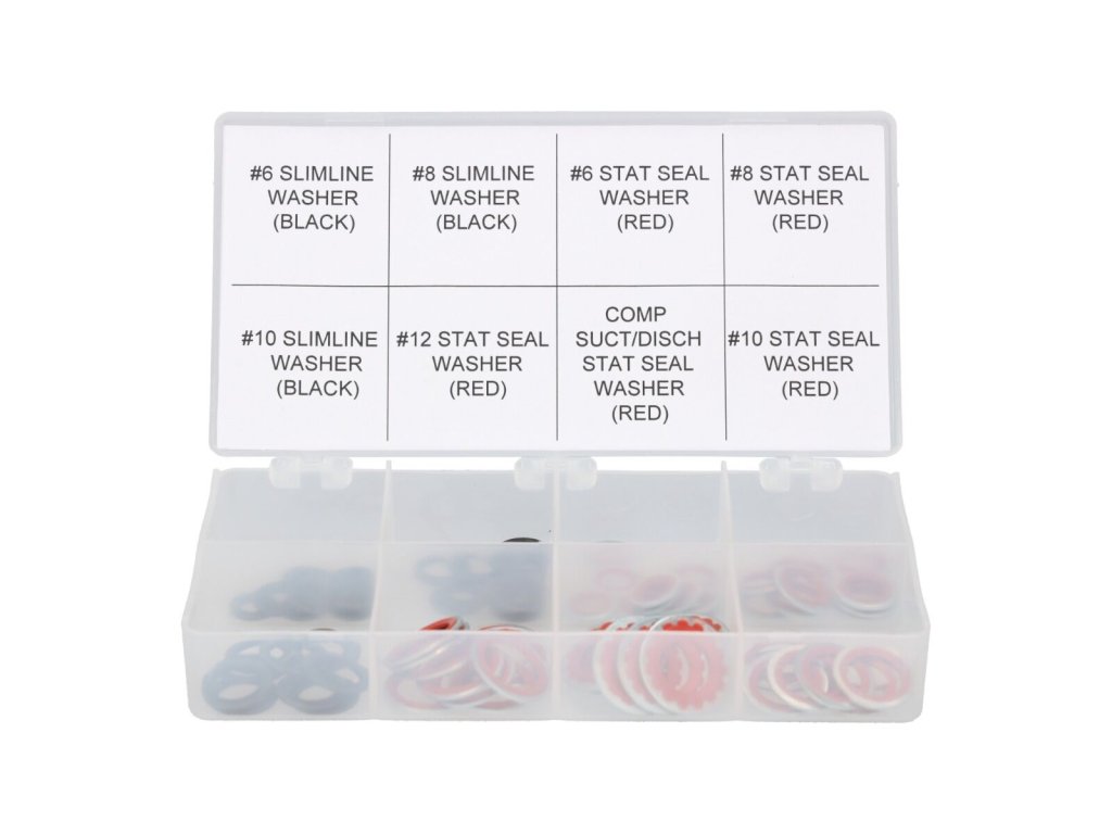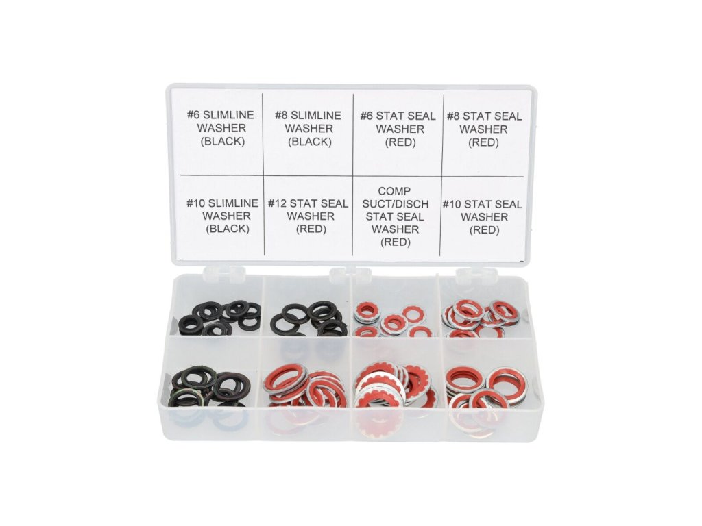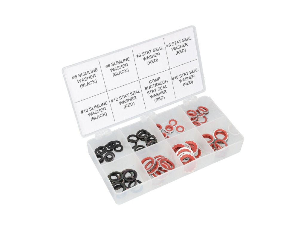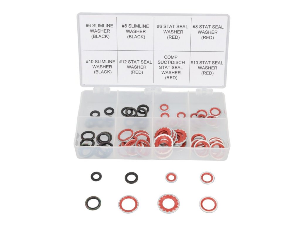 Sada obsahuje 80 kusů oblíbených kovopryžových těsnění a podložek, které se běžně používají při opravách spojů v automobilových klimatizačních systémech. Tyto těsnicí prvky jsou ideální pro zajištění spolehlivého a dlouhodobého utěsnění okruhů s chladivem.