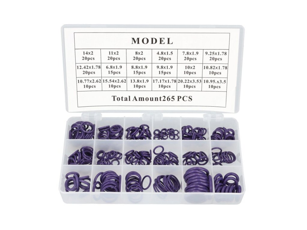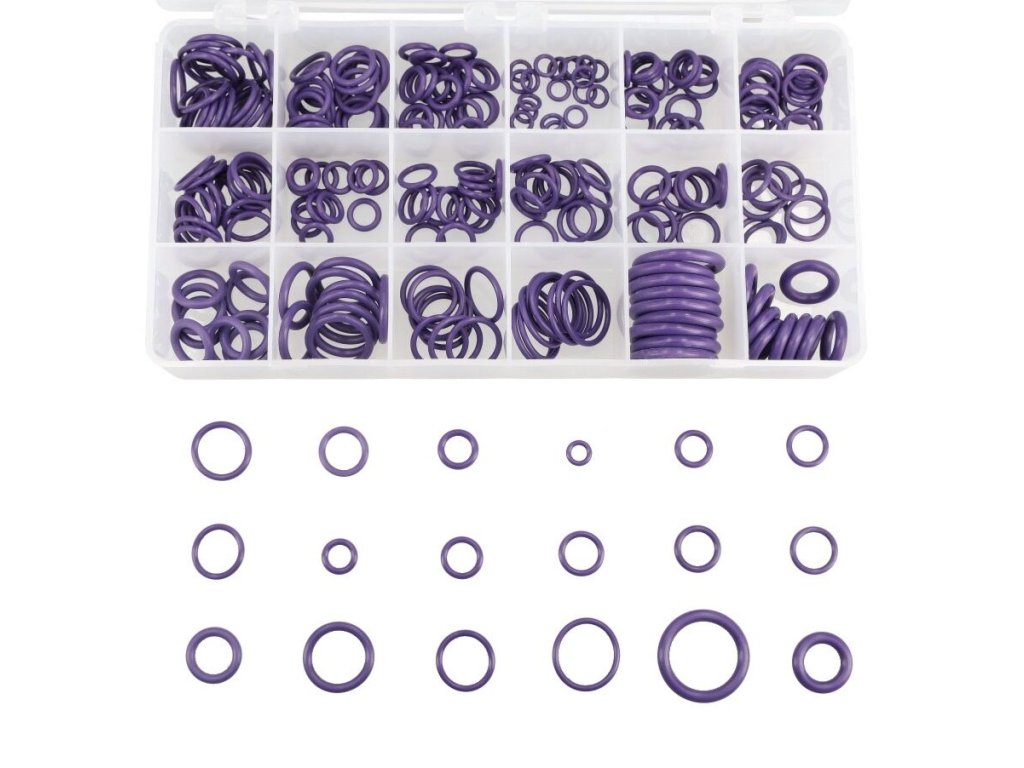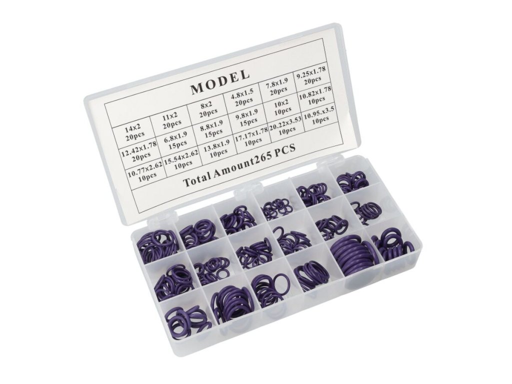 Univerzální sada 256 kusů fialových O-kroužků v 18 různých rozměrech. Ideální pomocník pro těsnění klimatizačních systémů ve vozidlech. Vhodná pro profesionální autoservisy i domácí použití.