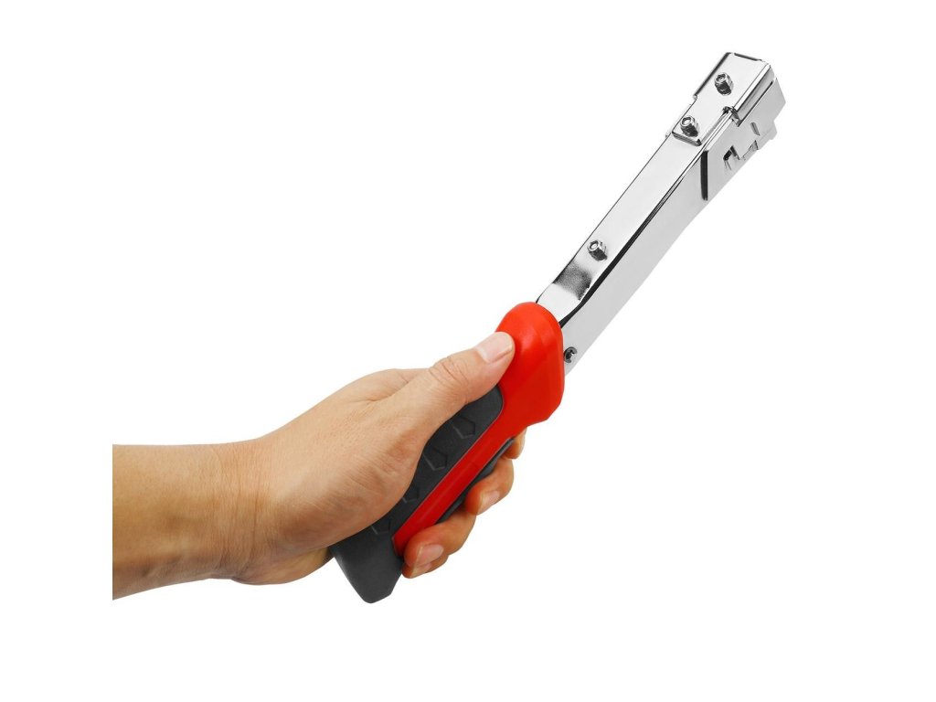 Jednoduchá a ergonomická konstrukce umožňuje efektivní práci jednou rukou – stačí úder sešívačkou o povrch a sponka je okamžitě zaražena. Lehká a odolná konstrukce zajišťuje dlouhou životnost a komfort při práci. Ideální volba pro čalounění nábytku, renovace i další práce vyžadující pevné a spolehlivé spojení materiálů.