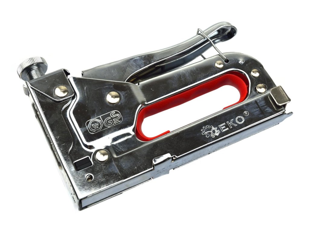 Sponkovačka 4–14 mm GEKO (stříbrná)Kovová čalounická sponkovačka GEKO je určena pro spojování různých materiálů s dřevěným nebo dřevotřískovým podkladem. Díky preciznímu napínacímu a spoušťovému mechanismu umožňuje rychlou, efektivní a přesnou práci.