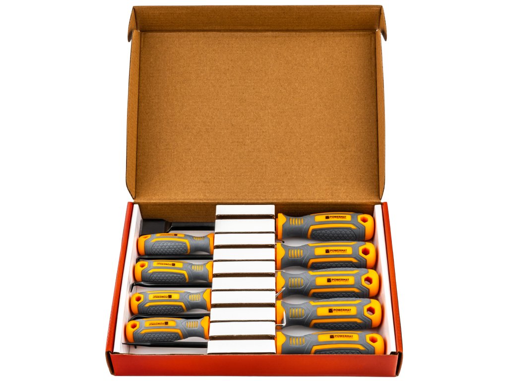 Nástroje jsou vyrobeny z kalené oceli s tvrdostí 40 HRC, která zajišťuje vysokou odolnost proti opotřebení, deformaci i prasknutí při intenzivním používání v dílně.