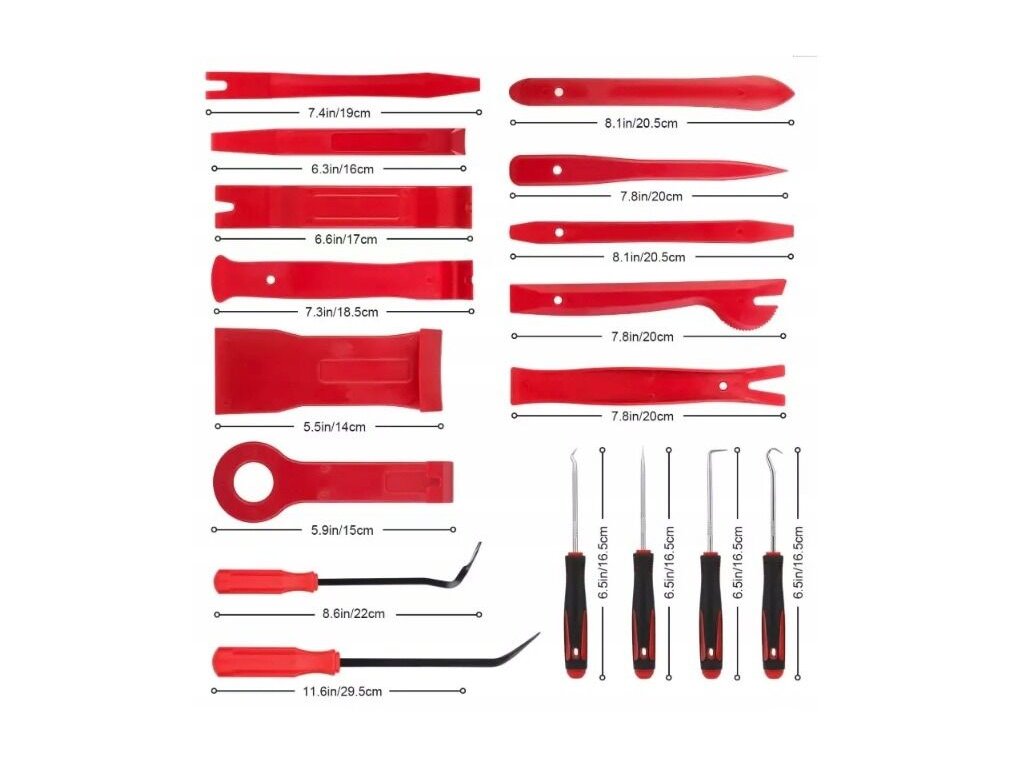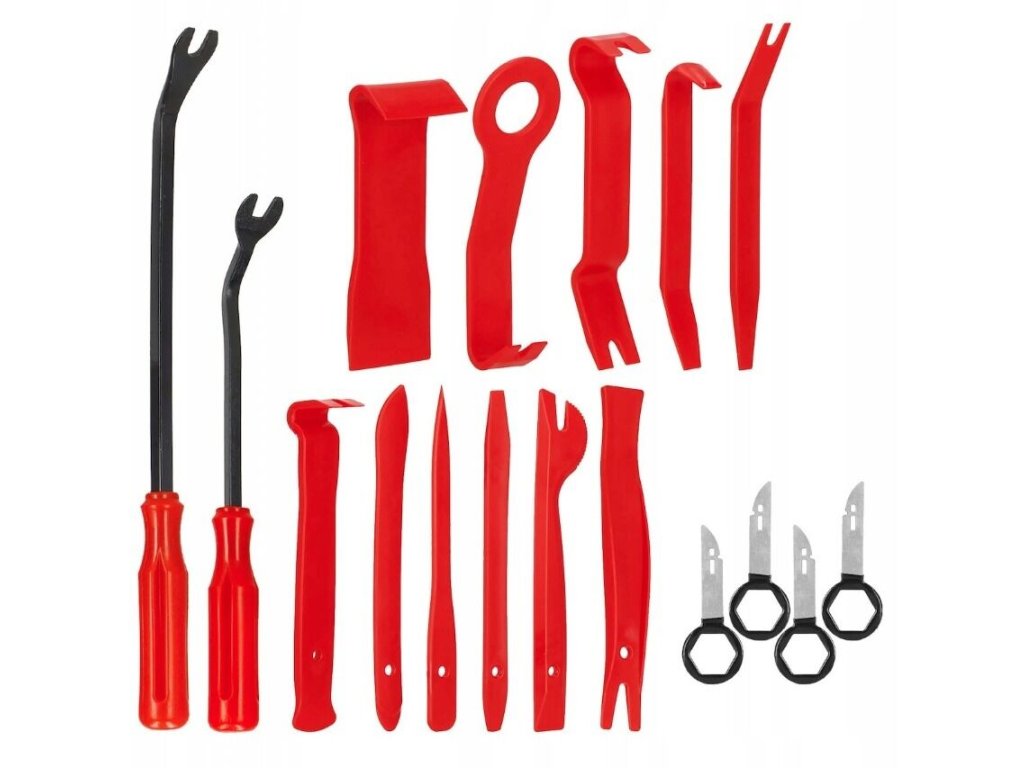 Profesionální 43dílná sada značky INVENTO je ideálním řešením pro mechaniky, servisní techniky, čalouníky i domácí kutily. Nástroje umožňují bezpečný demontáž interiérových prvků, čalounění, spon, lišt, palubních přístrojů i autorádií – a to bez rizika poškození povrchu.