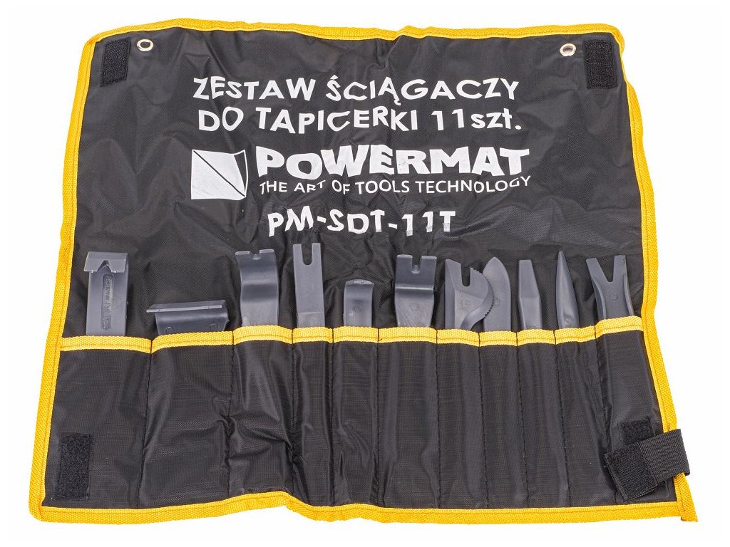 Kompletní sada stahováků Powermat PM-SDT-11T je určena k demontáži tapicerie, lišt, panelů a plastových úchytů v automobilech. Díky speciálním profilům a odolnému materiálu umožňuje snadnou práci bez poškození interiéru. Nářadí je vhodné pro autoservisy, karosárny, lakovny i domácí použití.