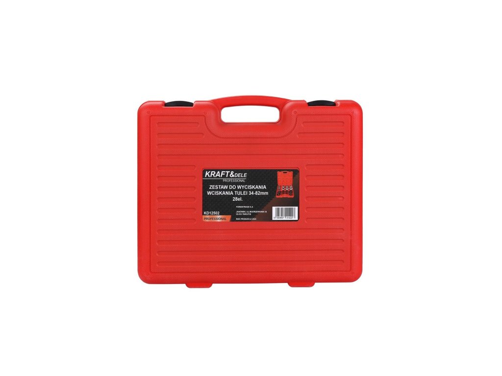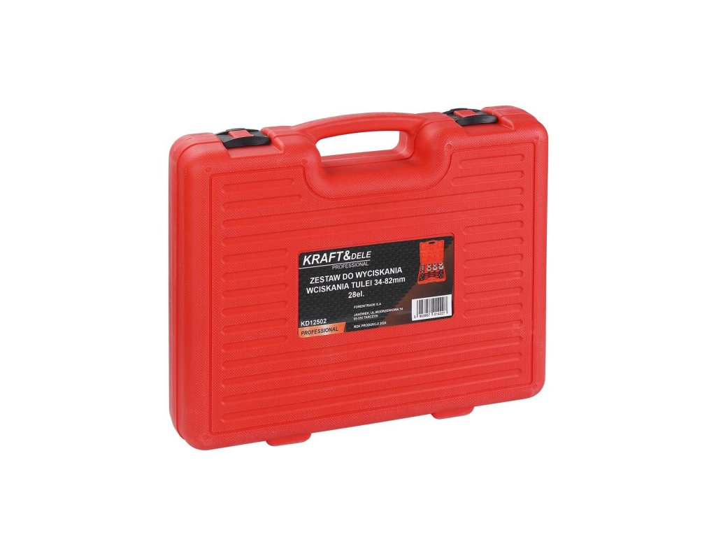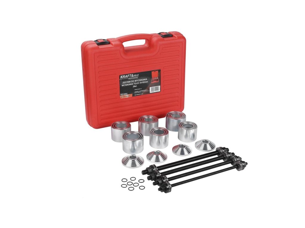 Model KD12502 značky Kraft&Dele je rozsáhlá 28dílná sada nástrojů pro montáž a demontáž kovopryžových pouzder (silentbloků), ložisek, gufer a dalších lisovaných dílů. Sadu lze používat jak na hydraulickém lisu, tak i s průchozím tažným válcem díky přiloženým závitovým tyčím se zabudovaným axiálním ložiskem, které snižují tření a prodlužují životnost sady.