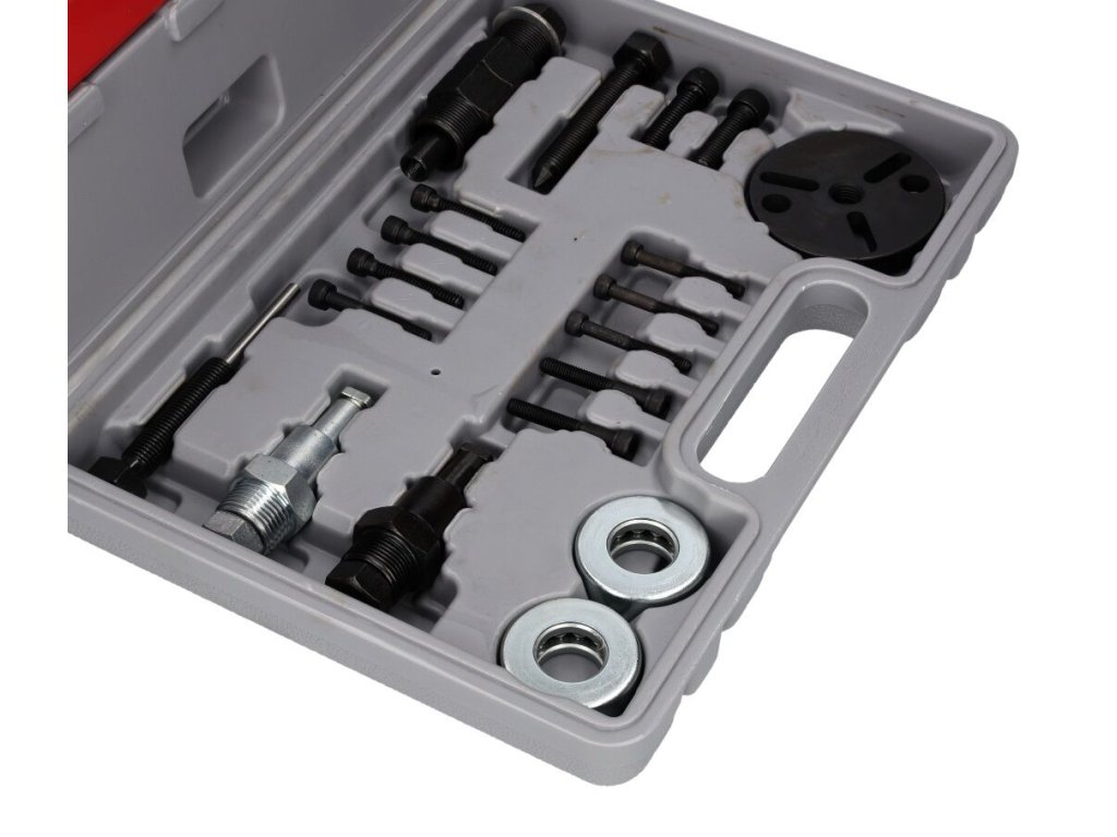 Profesionální sada stahováků pro demontáž spojky kompresoru klimatizace v automobilu. Určena pro práci s různými typy kompresorů používaných v osobních i užitkových vozidlech. Sada obsahuje také speciální klíč na spojku, který usnadňuje manipulaci při montáži a demontáži.