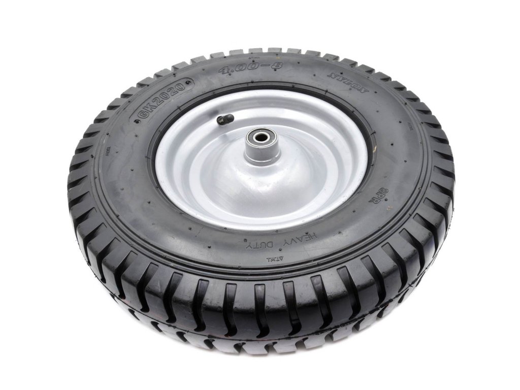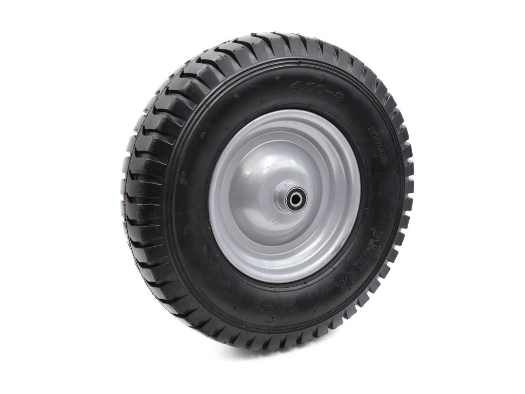 Kolo 4.00-8 8PR Heavy Duty pro stavební kolečka s maximální nosností 180 kg. Odolný kovový ráfek s práškovým nástřikem zajišťuje zvýšenou stabilitu. Celý je vyroben z vysoce kvalitních materiálů. 12mm osa v ceně.
