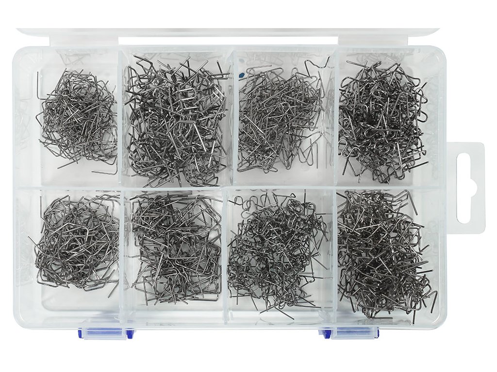 Sada 800 spon určených pro svářečky a přístroje na svařování plastů. Díky tvaru hrotů můžete provádět povrchové svařování, které spojí praskliny. Sada obsahuje ploché, vlnité, rohové a další typy spon.