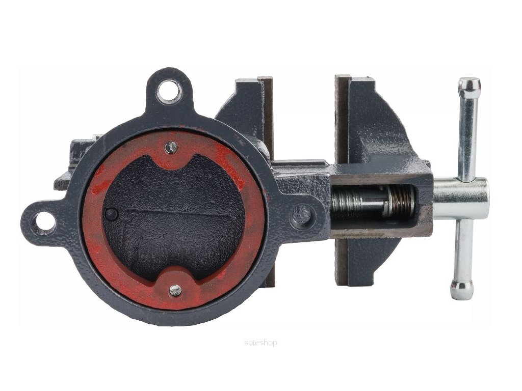 Možnost snadné výměny čelistí pomocí šroubů. Pevná otočná základna se 3 otvory pro připevnění k desce.