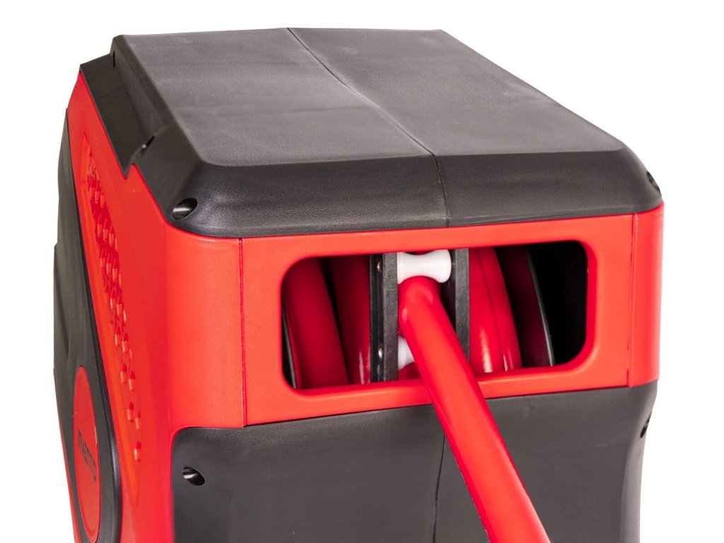 Hadice je vyrobena z pružného PVC, odolného vůči teplotám, mechanickému namáhání i chemikáliím. Automatický mechanismus s možností blokace po 50 cm a funkcí pomalého navíjení chrání hadici před zalomením a prodlužuje její životnost. Otočný držák umožňuje montáž na stěnu s rozsahem 180°, což zajišťuje maximální flexibilitu při práci.
