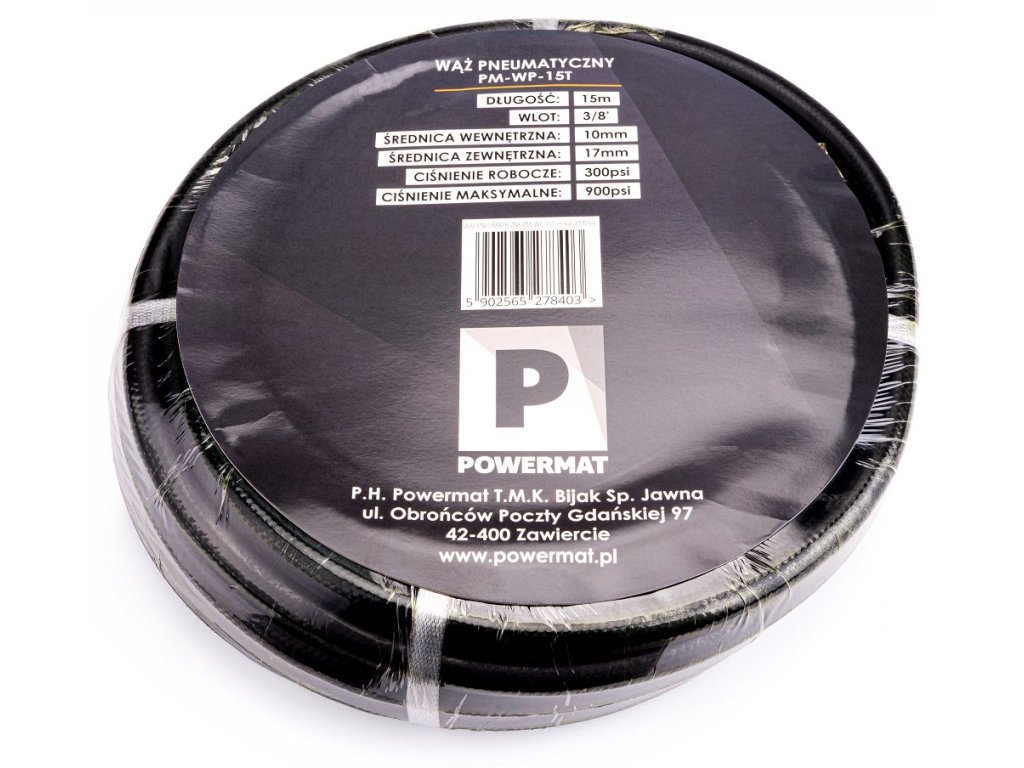 Pneumatická hadice Powermat PM-WP-15T je vyrobena z vysoce kvalitní olejivzdorné gumy, která zajišťuje pružnost, odolnost a dlouhou životnost i při vysokém zatížení. Díky standardním rychlospojkám je připravena k okamžitému použití s různým pneumatickým nářadím. Hadice není spirálová, proto ji lze snadno navinout na buben.