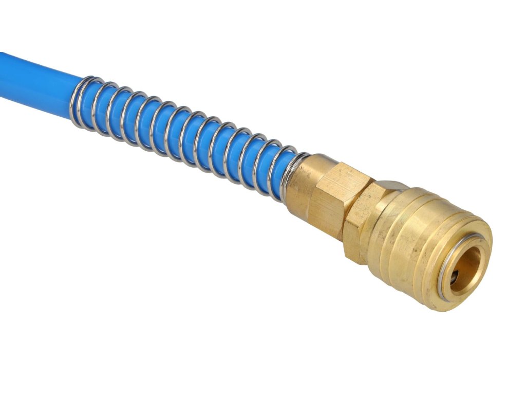 Hadice je osazena mosaznými rychlospojkami se zpevňující pružinou, což zajišťuje spolehlivé, těsné a dlouhodobě odolné spojení.