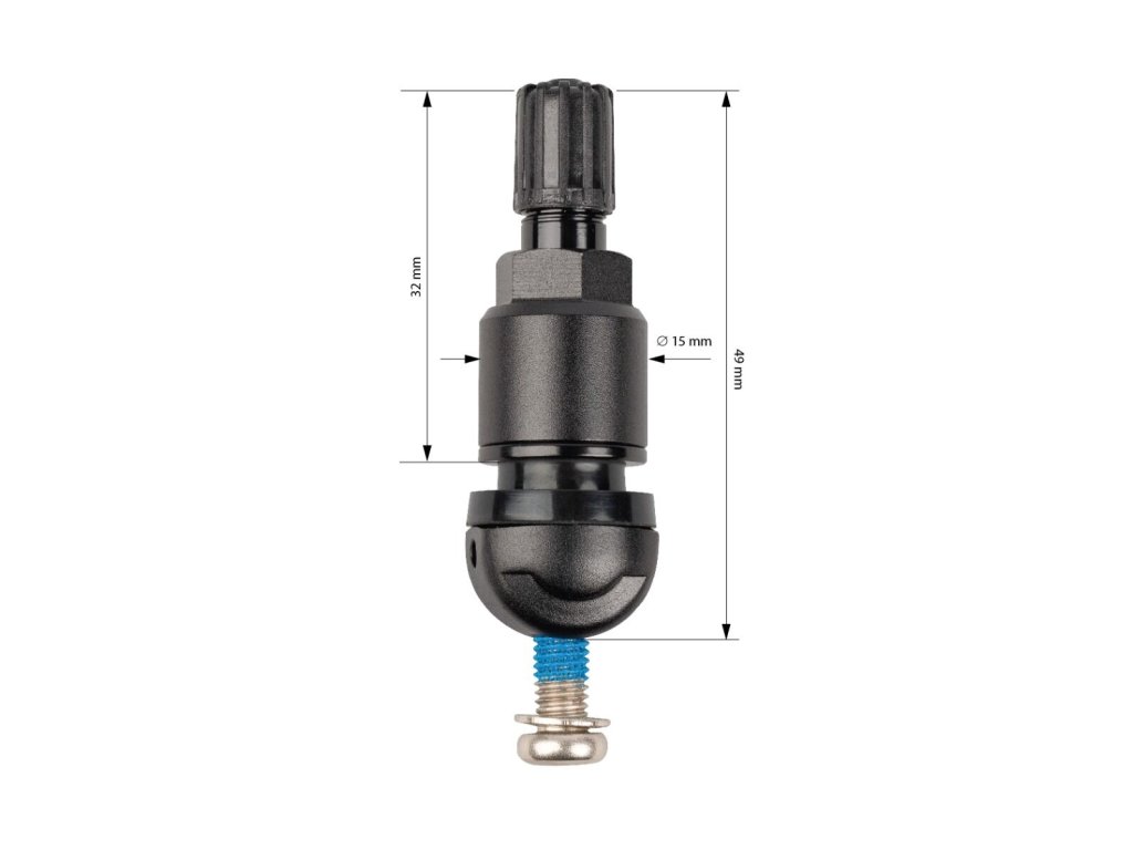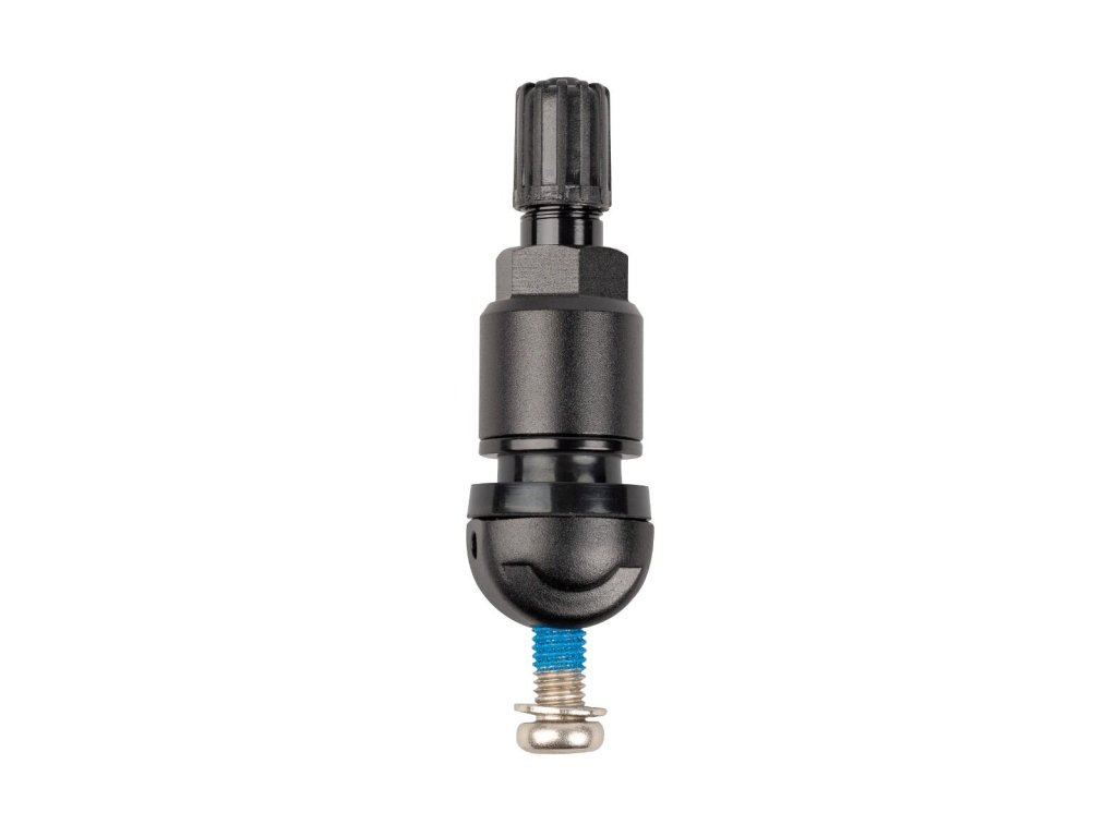 Černý hliníkový ventil určený pro čidla TPMS Autel MX-Sensor s možností regulace úhlu utažení. Dodává se v kompletu s upevňovacím šroubkem, který je zajištěn speciálním lepidlem na závitu pro bezpečné a správné použití.