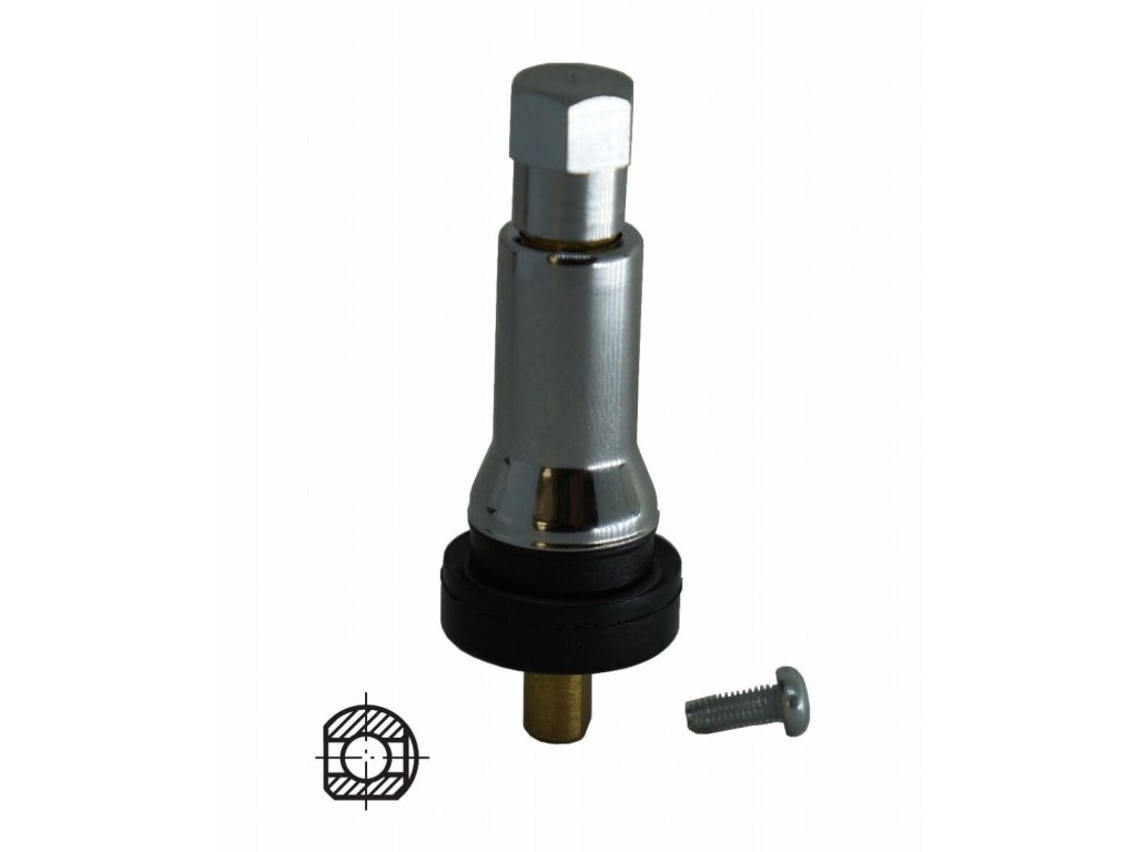 Gumový ventil TPMS určený pro originální senzory Schrader používané při prvovýrobě, stejně jako pro univerzální senzory Schrader EZ-Sensor 2.0. Ventil je vybaven elegantním chromovaným krytem a slouží jako kvalitní náhradní díl.