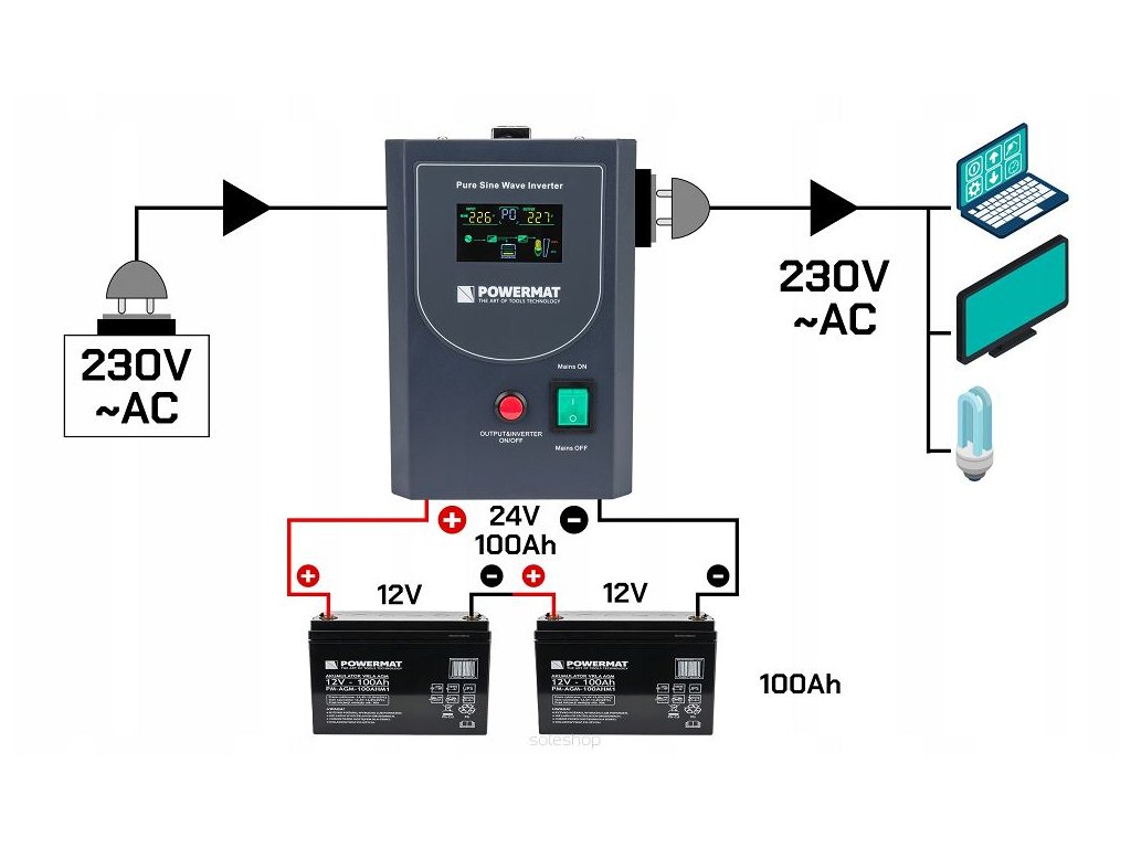 Záložní zdroj UPS (Uninterruptible Power Supply) od značky POWERMAT je klíčovým prvkem pro zajištění nepřetržitého napájení a ochrany vašich elektronických zařízení. Tento model nabízí vysokou efektivitu a spolehlivost v jednom kompaktním zařízení, které kombinuje funkce DC/AC měniče, záložního zdroje UPS a automatické nabíječky baterií.
