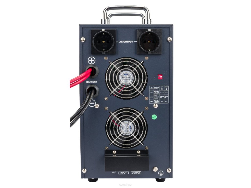 - Rozšiřitelnost: Možnost připojení externích baterií/bateriových sad (paralelně) o napětí 24V, dva výstupní zásuvky 230V umožňují souběžný provoz dvou zařízení.