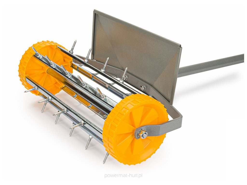 Ruční provzdušňovač trávníku PM-AR-34T, Powermat PM1122 s kolečky, pro provzdušňování trávníku propichováním půdy hroty. Jedná se o nezbytné zařízení pro údržbu okrasných trávníků, spočívající v prořezávání trávníku. Provzdušňování trávníku je procedura provzdušnění trávy, kterou by mělo být prováděno dvakrát za sezónu. Cílem je uvolnění a provzdušnění půdy.