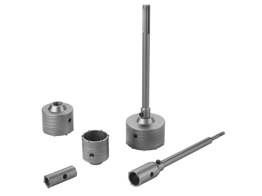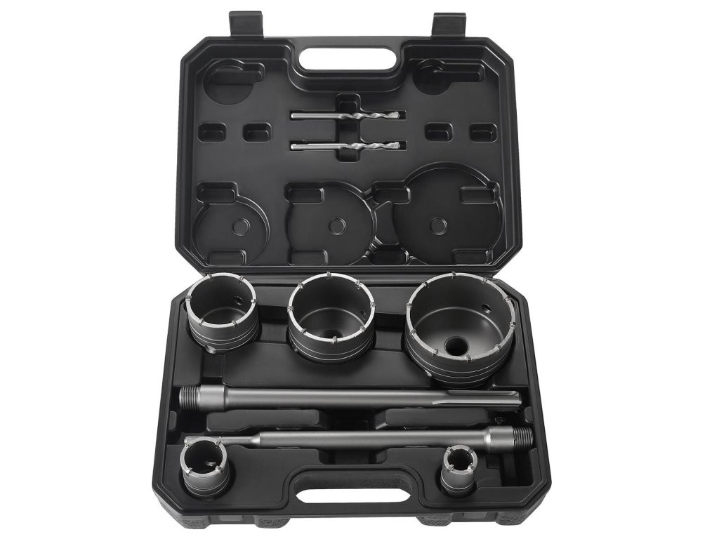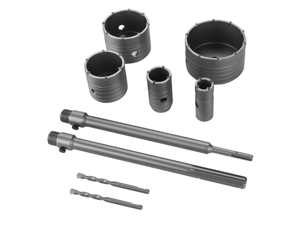 Sada je vybavena adaptéry SDS PLUS a SDS MAX, takže je kompatibilní s většinou běžně dostupných vrtaček. Každá korunka má pískovaný povrch a výměnné vodicí vrtáky, což dále zvyšuje komfort a funkčnost při práci. Celý komplet je uložen v odolném plastovém kufříku pro snadné skladování a transport.