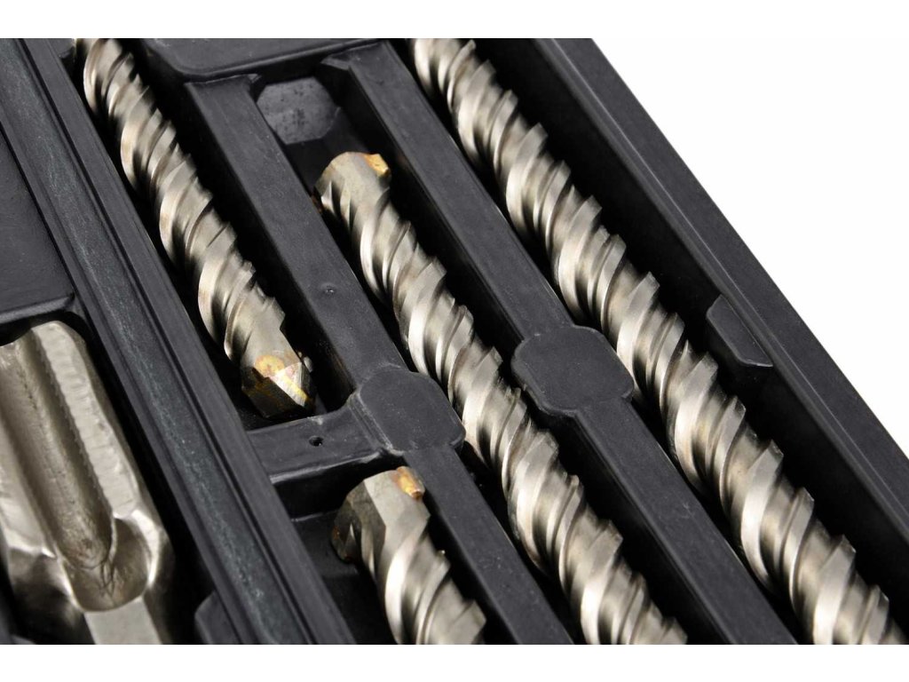 Ergonomicky tvarované spirálové drážky umožňují účinný odvod odvrtaného materiálu, snižují zatížení nástroje a zvyšují komfort při používání. Celá sada je dodávána v pevném a praktickém kufříku pro snadné skladování i přepravu.