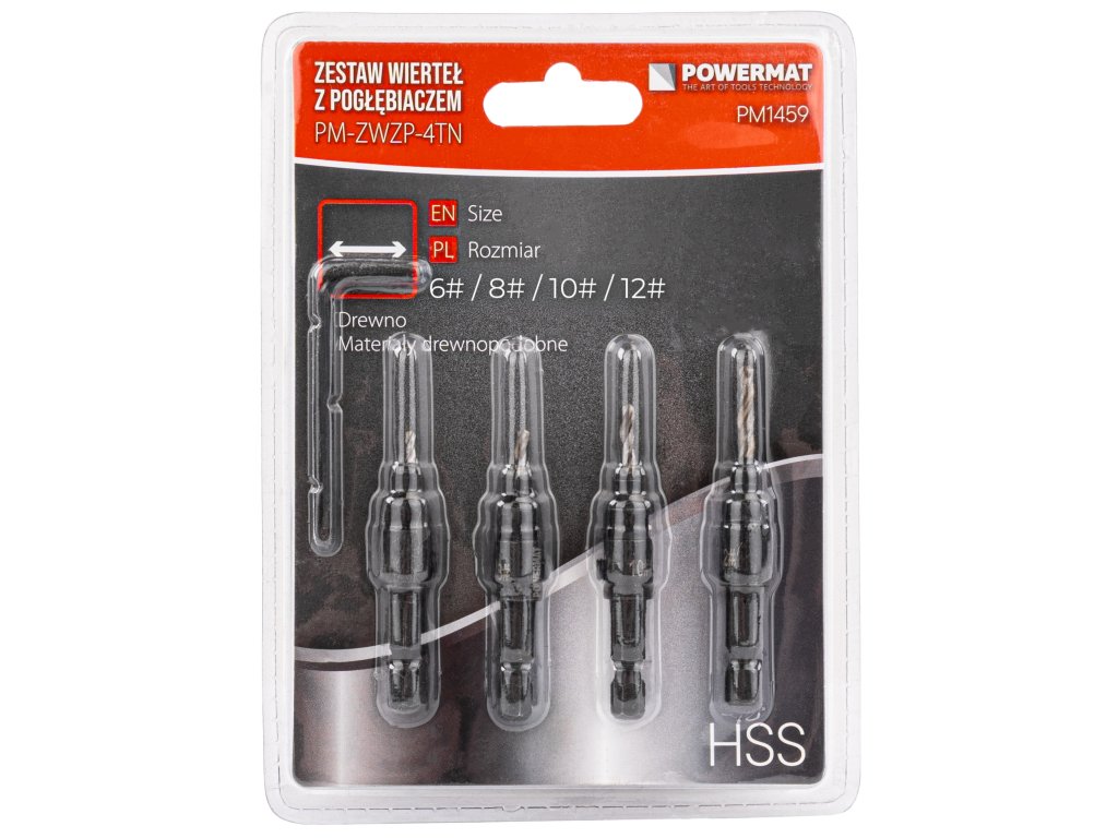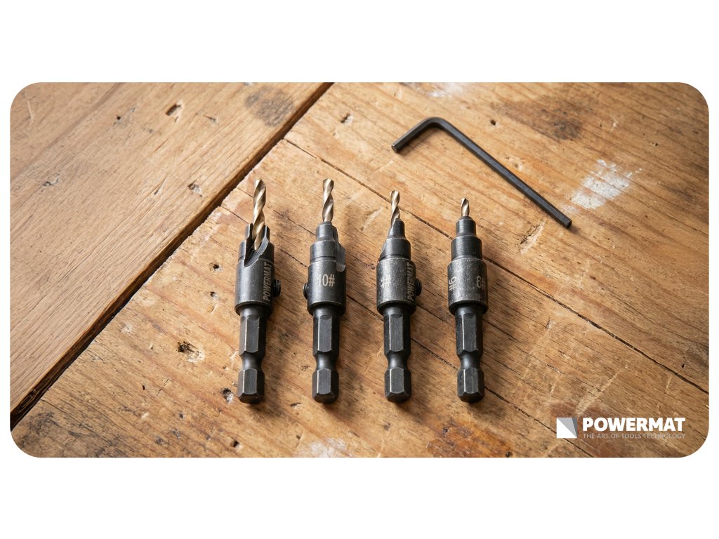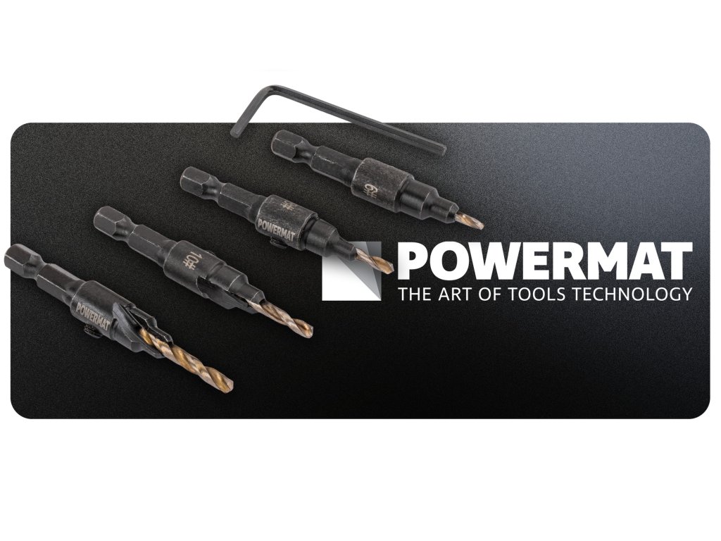 Sada vrtáků Powermat PM-ZWZP-4TN je určena pro přesné předvrtání otvorů a současné zahloubení pod hlavu vrutu. Díky funkci 3v1 zvládnete vrtání, fazetování i zapuštění hlavy šroubu v jednom kroku, bez nutnosti výměny nástrojů. Ideální pro montáž nábytku i práci v dílně.