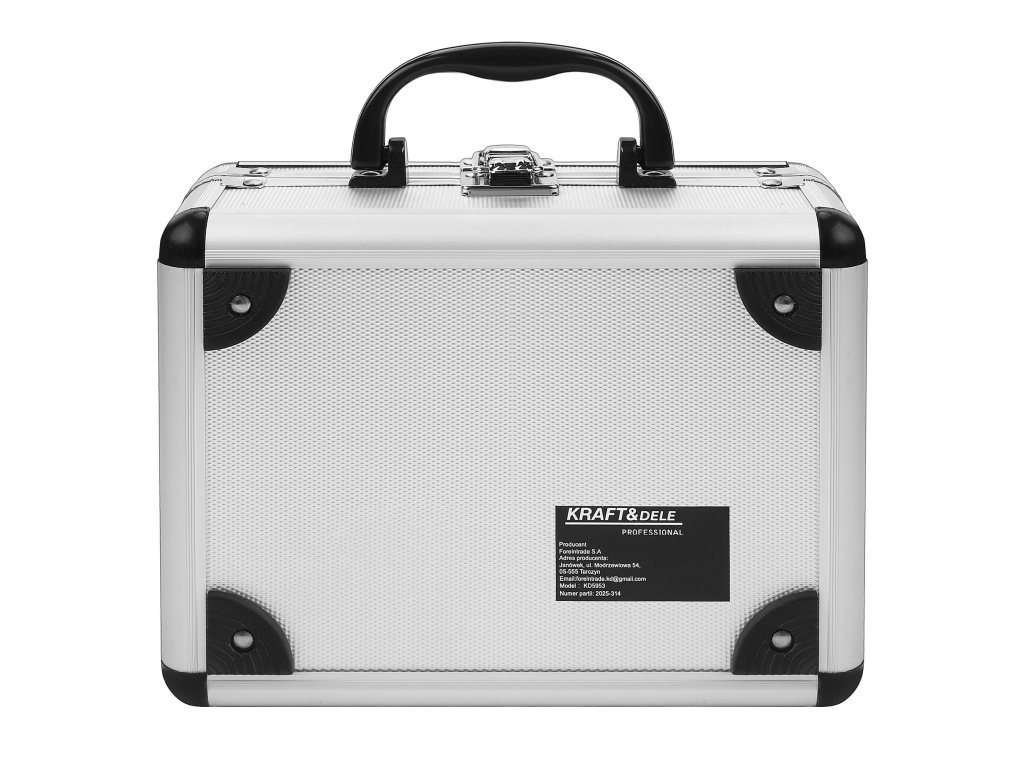 Všechny prvky jsou přehledně uloženy v odolném kufříku s rukojetí a zavírací přezkou, což usnadňuje přenášení, organizaci a bezpečné skladování nářadí.