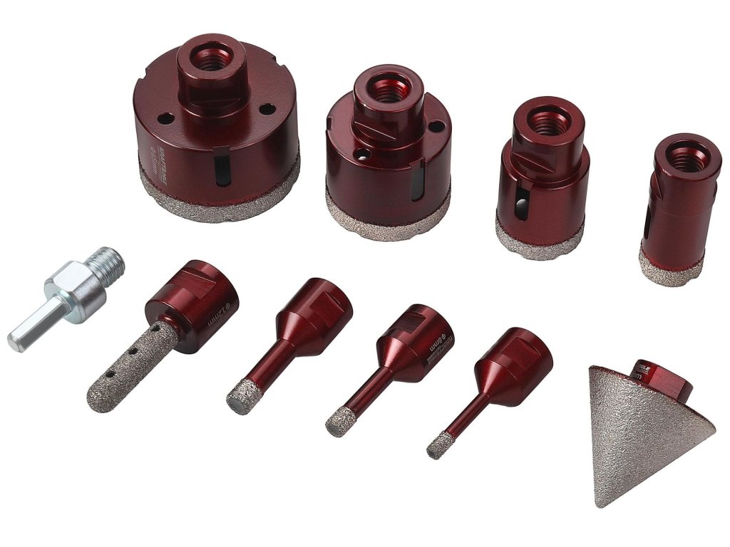 - 8 diamantových korunek o průměrech 6–65 mm