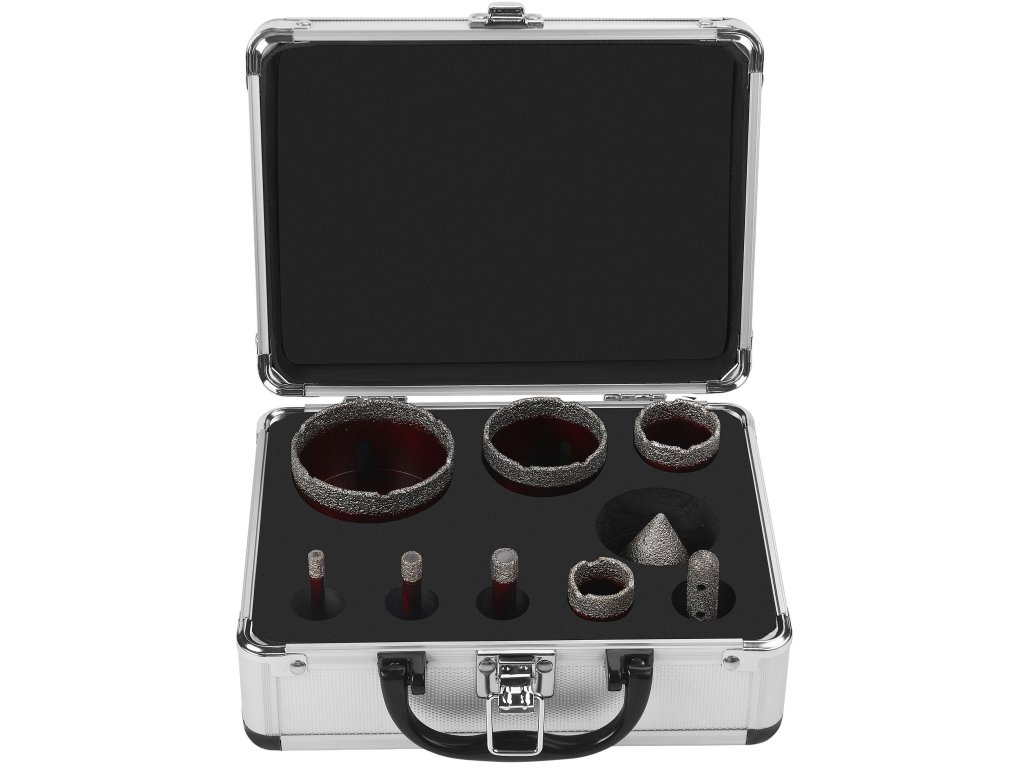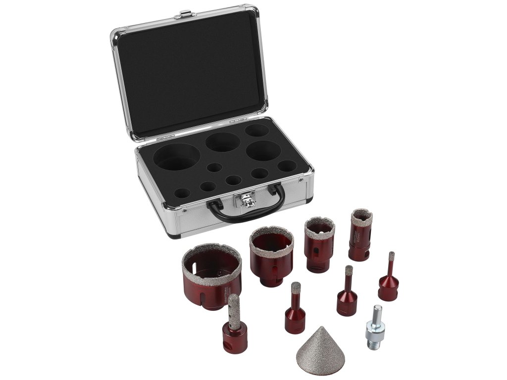 - diamantové korunky: 8 ks (6–65 mm)