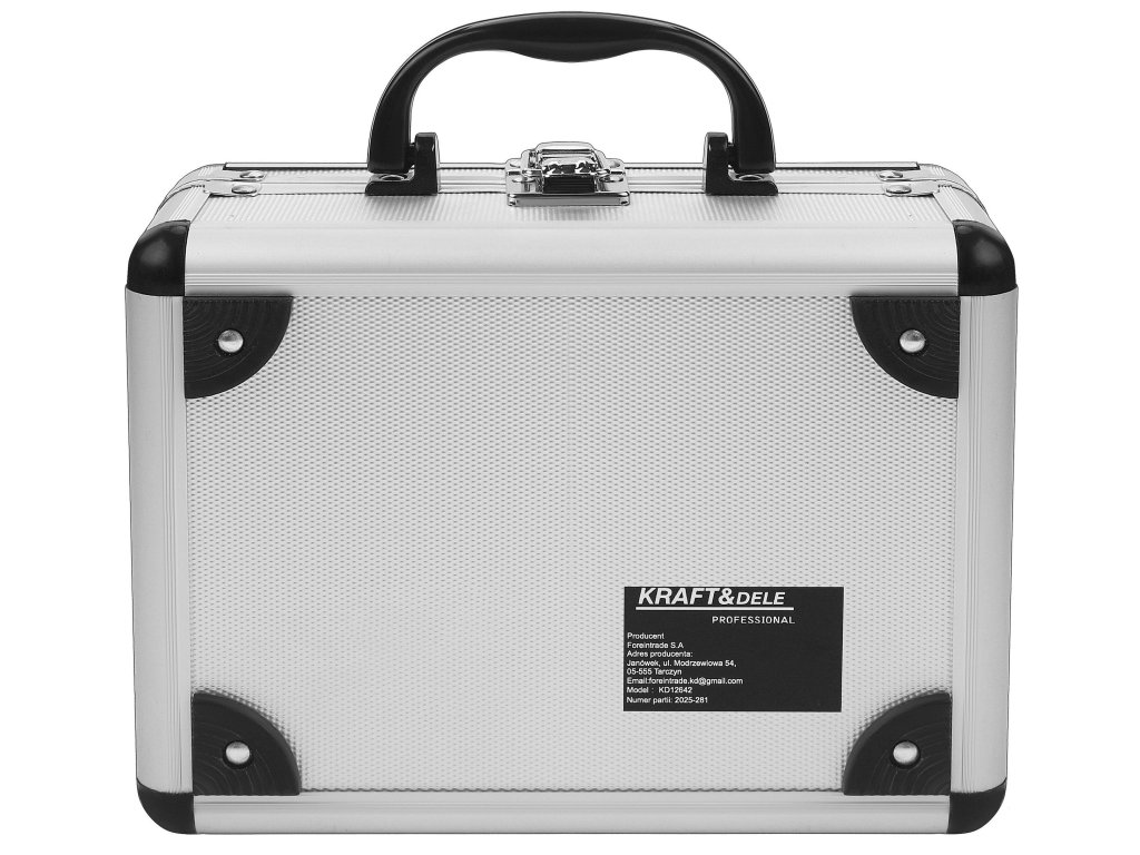 Všechny komponenty jsou uloženy v pevném kufříku s rukojetí a zavírací přezkou, což usnadňuje přenášení, organizaci a bezpečné skladování.