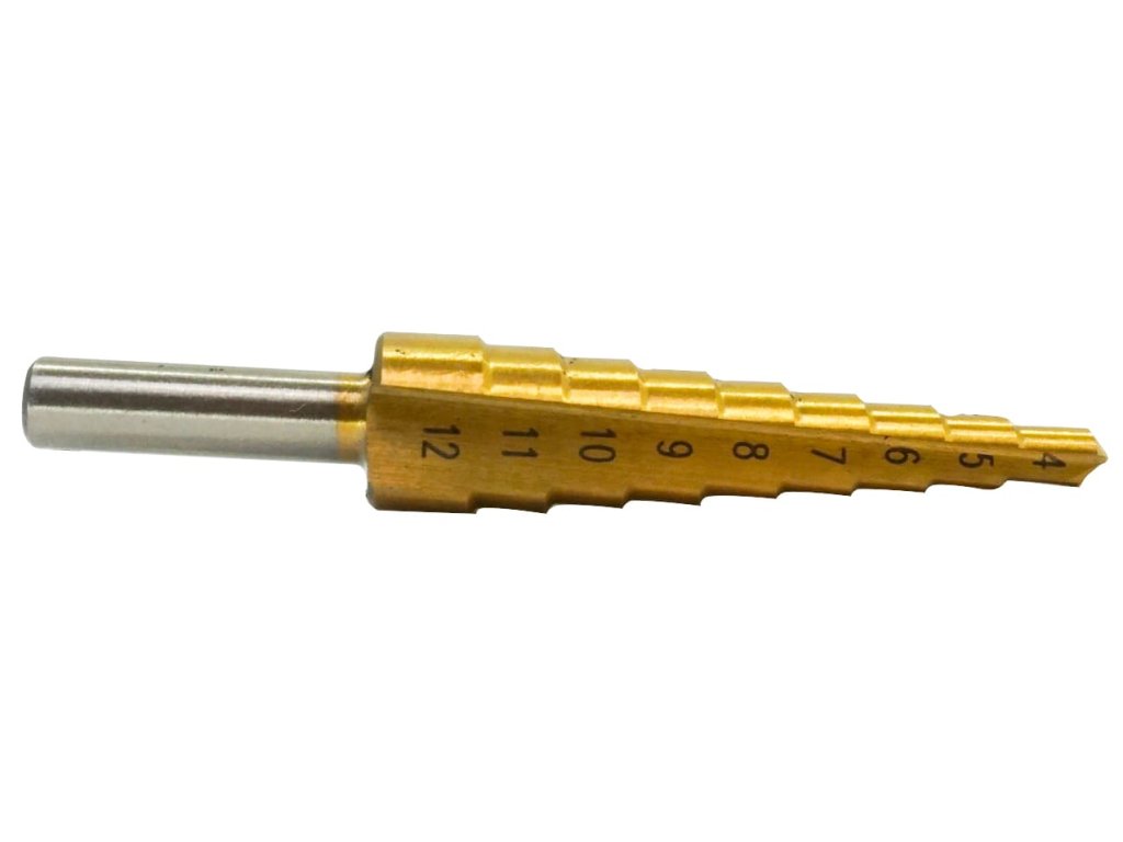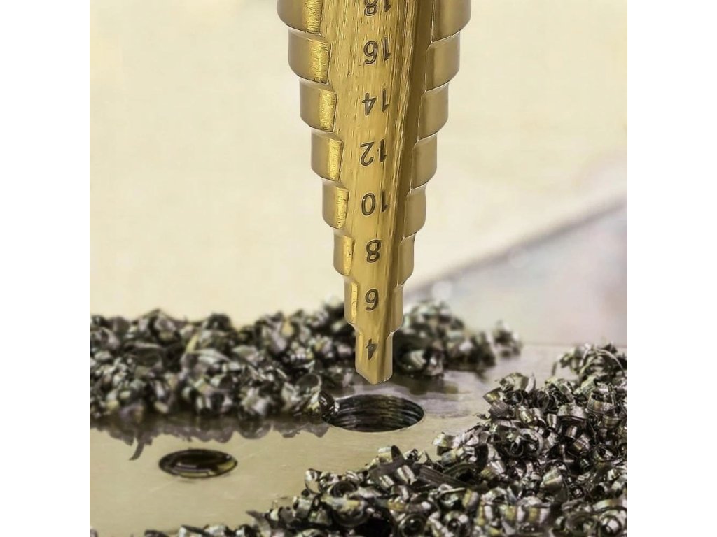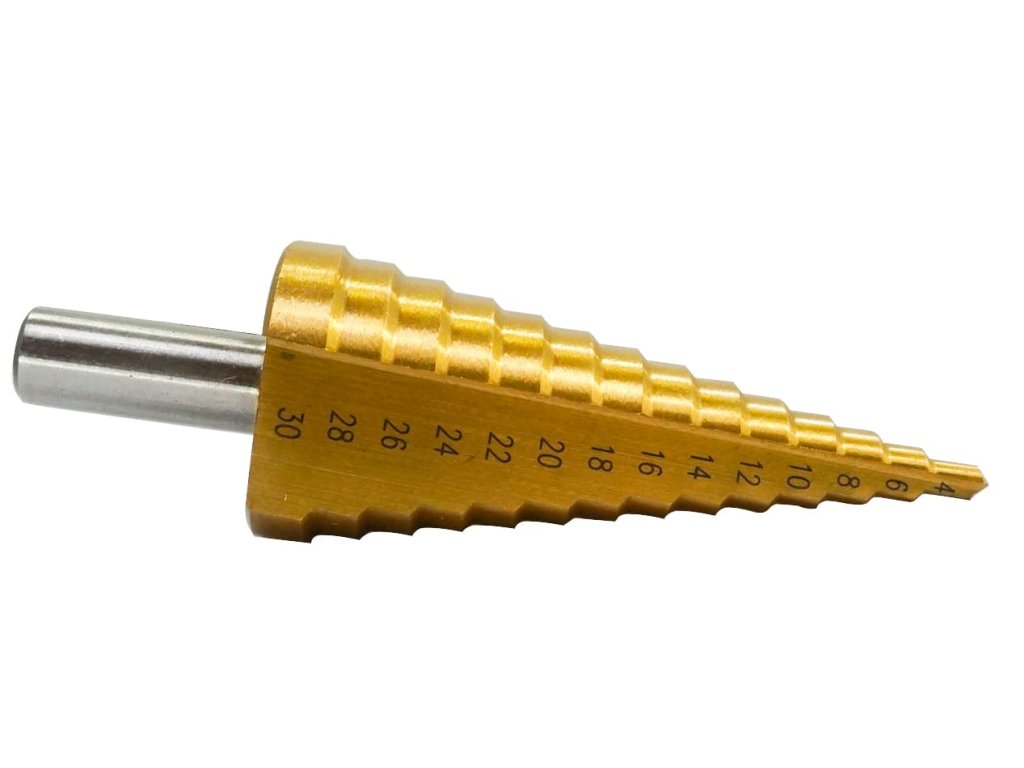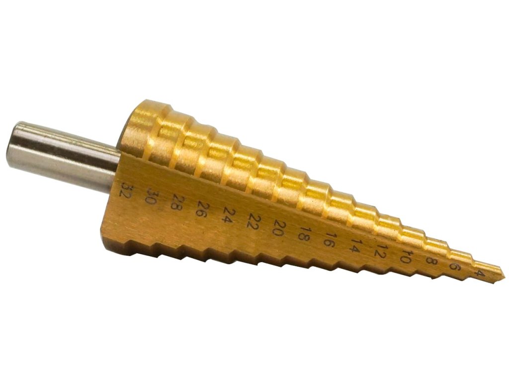Stupňové vrtáky vysoké kvality s titanovým povlakem, vyrobené technologií HSS, s válcovými stopkami a čitelnou číselnou stupnicí. Rozsah vrtáků je od 4 mm do 32 mm. Vrtáky jsou vhodné pro kovy, tenkostěnné ocelové plechy a plasty. Nezastupitelné při centrování, vrtání nových a zvětšování starých otvorů. Jsou ideální pro použití v klempířství, zámečnictví a truhlářství. Sada je umístěna v praktickém kufříku, který usnadňuje skladování a přepravu.